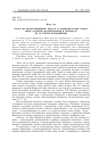 В статье рассматривается образ Далекой возлюбленной в романсах С. Рахманинова ор. 38 на стихи поэтов-символистов. В музыкальной науке проблема Русского Эроса на сегодняшний день не получила должного освещения. Цель статьи – выявить в романсах С. Рахманинова образы-знаки куртуазного текста. Подвергнув анализу романсы «К ней» и «Ау!», автор обнаружил, что в драматургии романсов отражен новый тип любовной лирики – синтез возвышенно-одухотворенного и религиозно-мистического начал, который соответствовал концепции «Вечной Женственности» Вл. Соловьёва