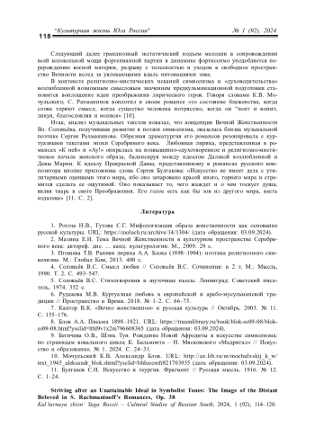 1. Рогоза Н.В., Гутова С.Г. Мифологизация образа женственности как основание русской культуры. URL: https://moluch.ru/archive/14/1304/(дата обращения: 03.09.2024).