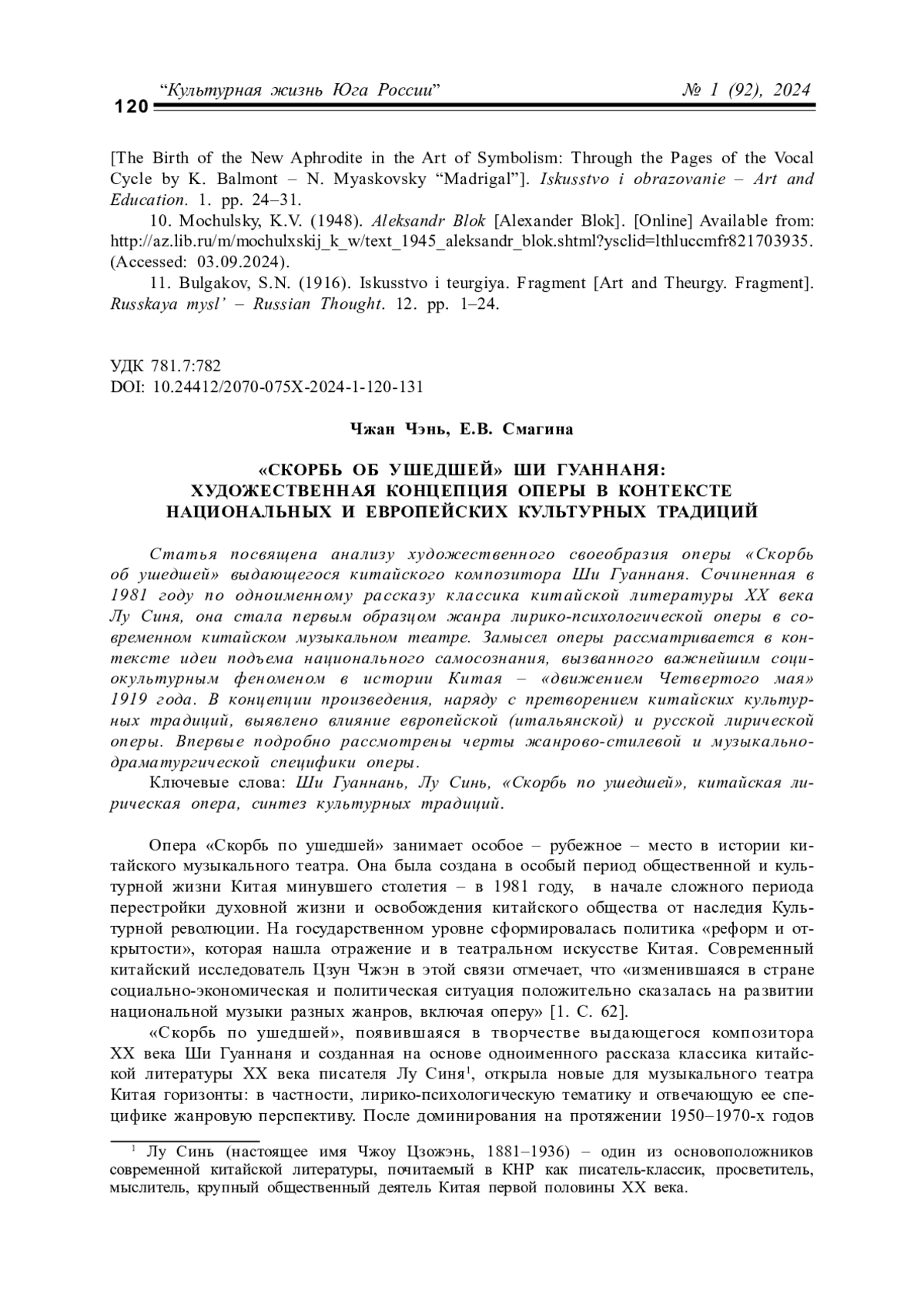 Статья посвящена анализу художественного своеобразия оперы «Скорбь об ушедшей» выдающегося китайского композитора Ши Гуаннаня. Сочиненная в 1981 году по одноименному рассказу классика кит айской литературы XX века Лу Синя, она стала первым образцом жанра лирико-психологической оперы в современном китайском музыкальном театре. Замысел оперы рассматривается в контексте идеи подъема национального самосознания, вызванного важнейшим социокультурным феноменом в истории Китая – «движением Четвертого мая» 1919 года. В концепции произведения, наряду с претворением китайских культурных традиций, выявлено влияние европейской (итальянской) и русской лирической оперы. Впервые подробно рассмотрены черты жанрово-стилевой и музыкальнодраматургической специфики оперы.