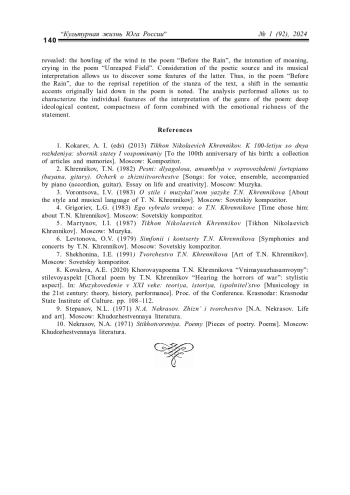 Статья посвящена анализу двух хоровых поэм Т. Н. Хренникова на стихи Н. А. Некрасова – «Перед дождем» и «Несжатая полоса», вошедших в ор. 20. Актуальность обращения к хоровым сочинениям отечественного композитора-классика обусловлена отсутствием музыковедческих исследований, рассматривающих данную область наследия композитора. В процессе анализа поэм, наряду со спецификой музыкальной формы, выявляется взаимосвязь образного содержания произведений с музыкально-выразительными средствами, характеризуются особенности интерпретации поэтического текста, раскрываются индивидуальные черты трактовки жанра поэмы