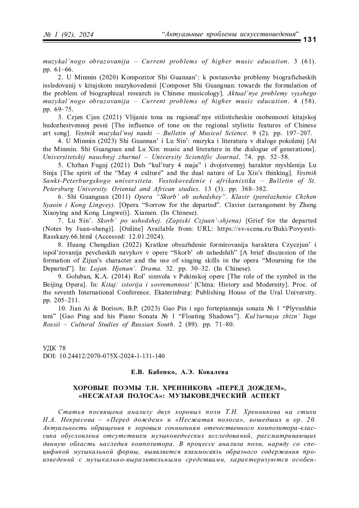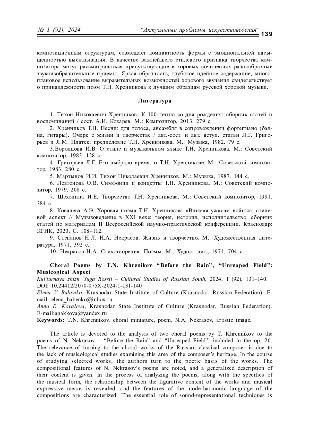 8. Ковалева А.Э. Хоровая поэма Т.Н. Хренникова “Внимая ужасам войны”: стилевой аспект // Музыковедение в ХХI веке: теория, история, исполнительство: сборник статей по материалам II Всероссийской научно-практической конференции. Краснодар: КГИК, 2020. С. 108-112.