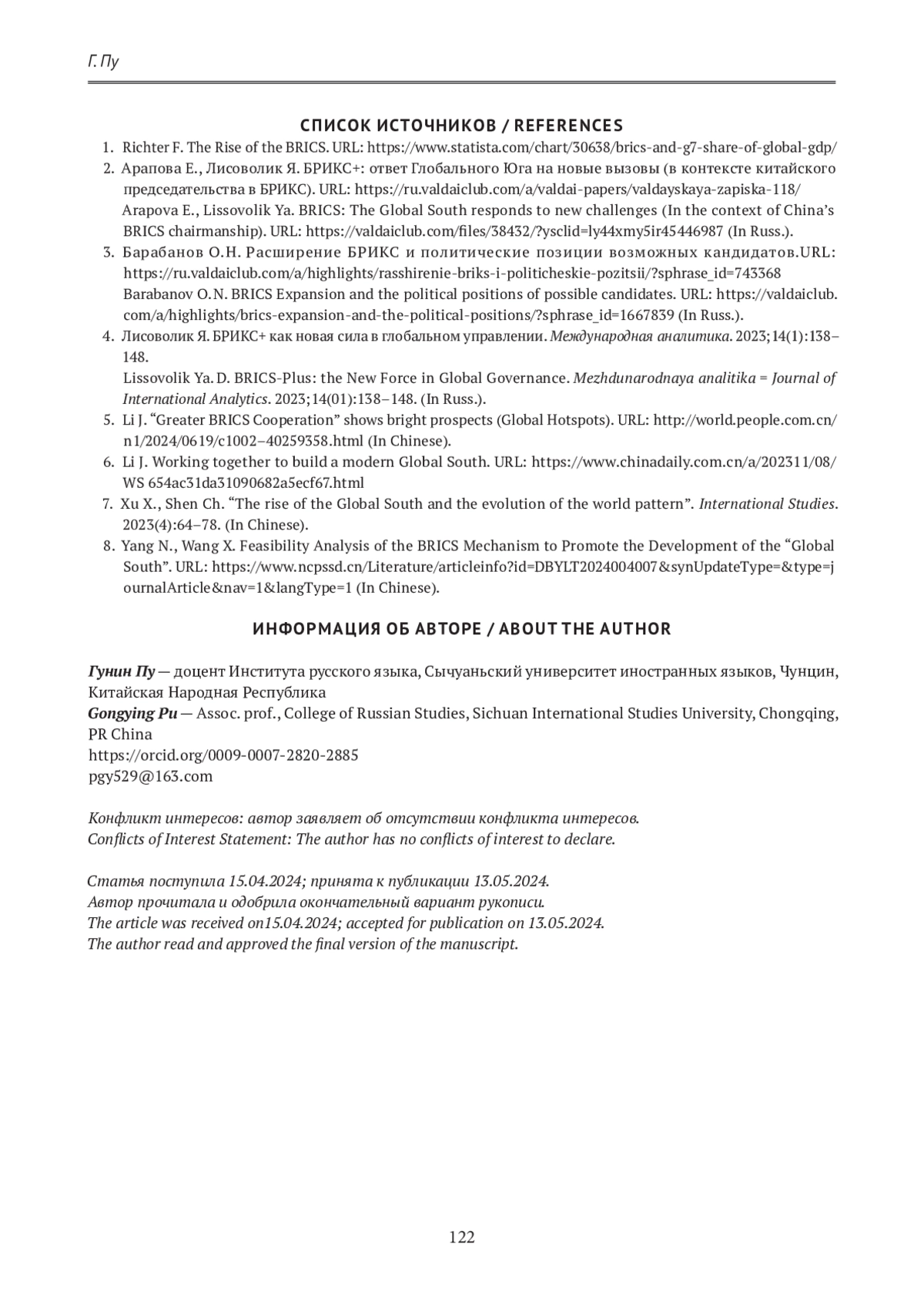 4. Лисоволик Я. БРИКС+ как новая сила в глобальном управлении. Международная аналитика. 2023;14(1):138- 148.