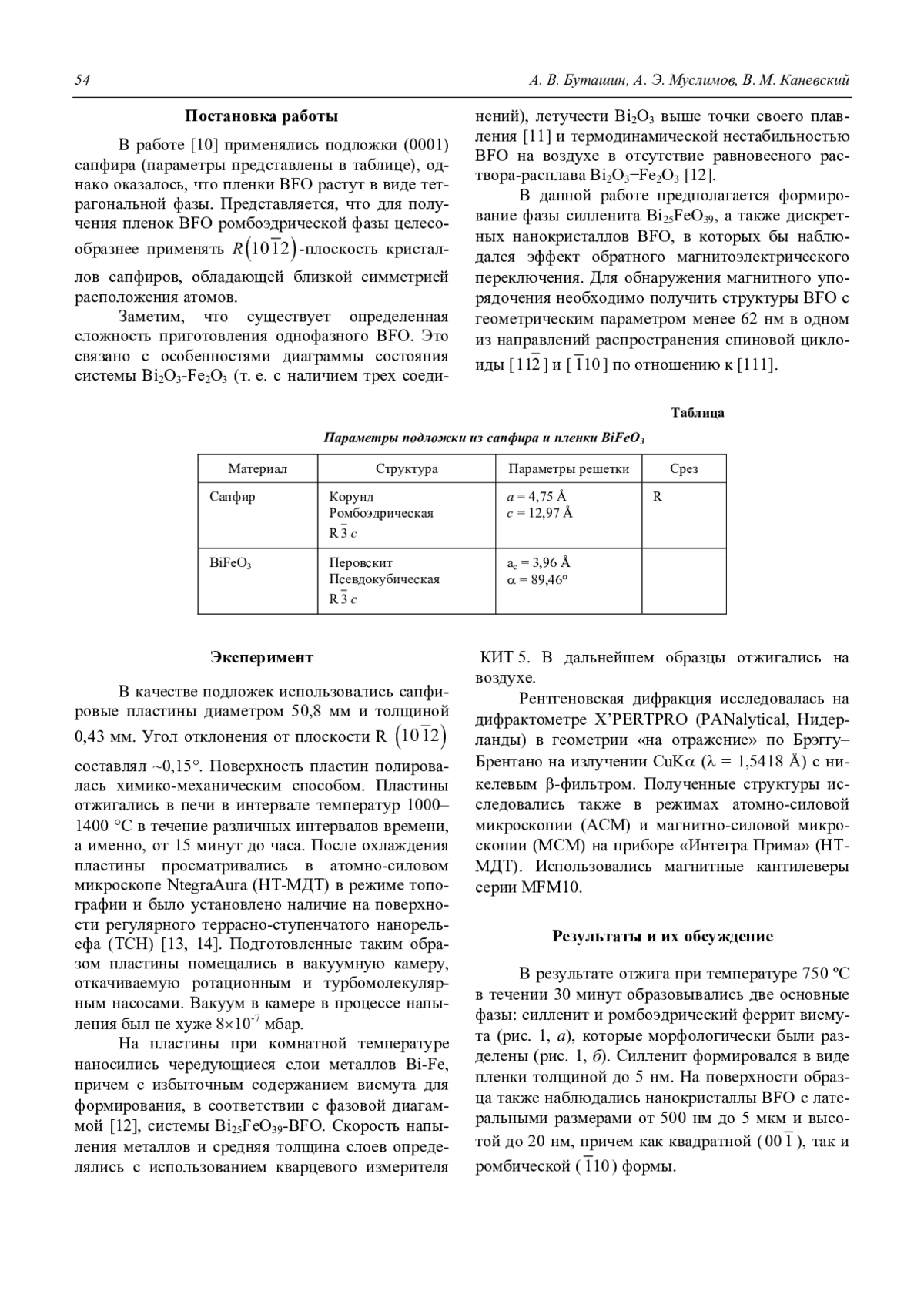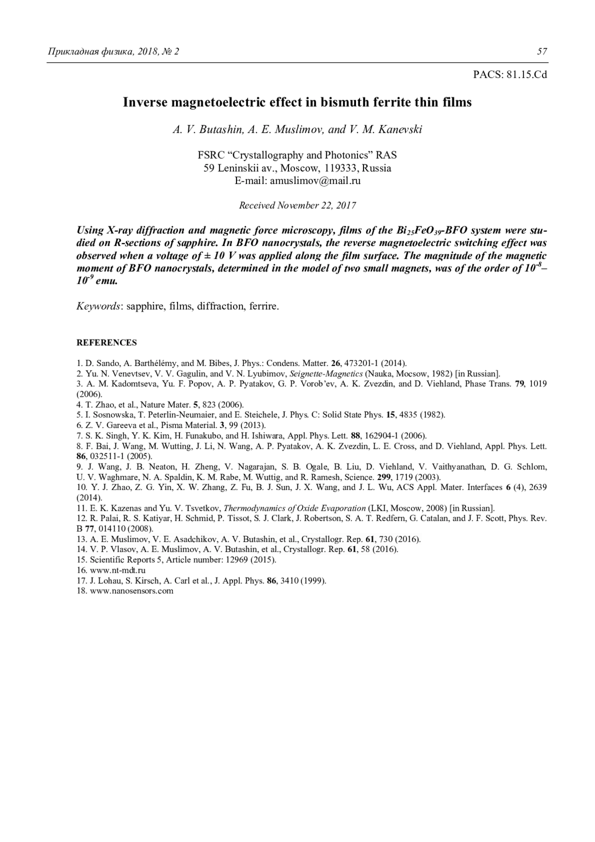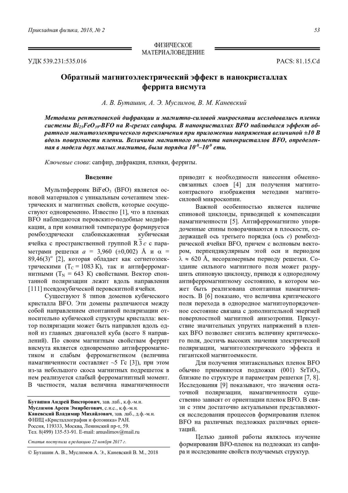 Буташин А. В., Муслимов А. Э., Каневский В. М. Обратный магнитоэлектрический эффект в нанокристаллах феррита висмута 53