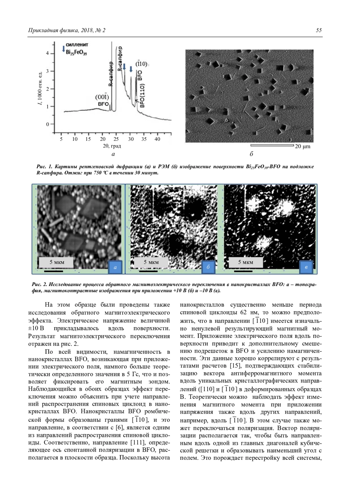 В работе методами рентгеновской дифракции и магнитно-силовой микроскопии исследовались пленки системы Bi25FeO39-BFO на R-срезах сапфира. В нанокристалликах BFO наблюдался эффект обратного магнитоэлектрического переключения при приложении напряжения величиной ±10 В вдоль поверхности пленки. Величина магнитного момента нанокристалликов BFO, определенная в модели двух малых магнитов, была порядка 10-8–10-9 emu, что, по-видимому, и позволило формировать магнито-контрастные изображения без нанесения обменно-связанных слоев на поверхность пленки.