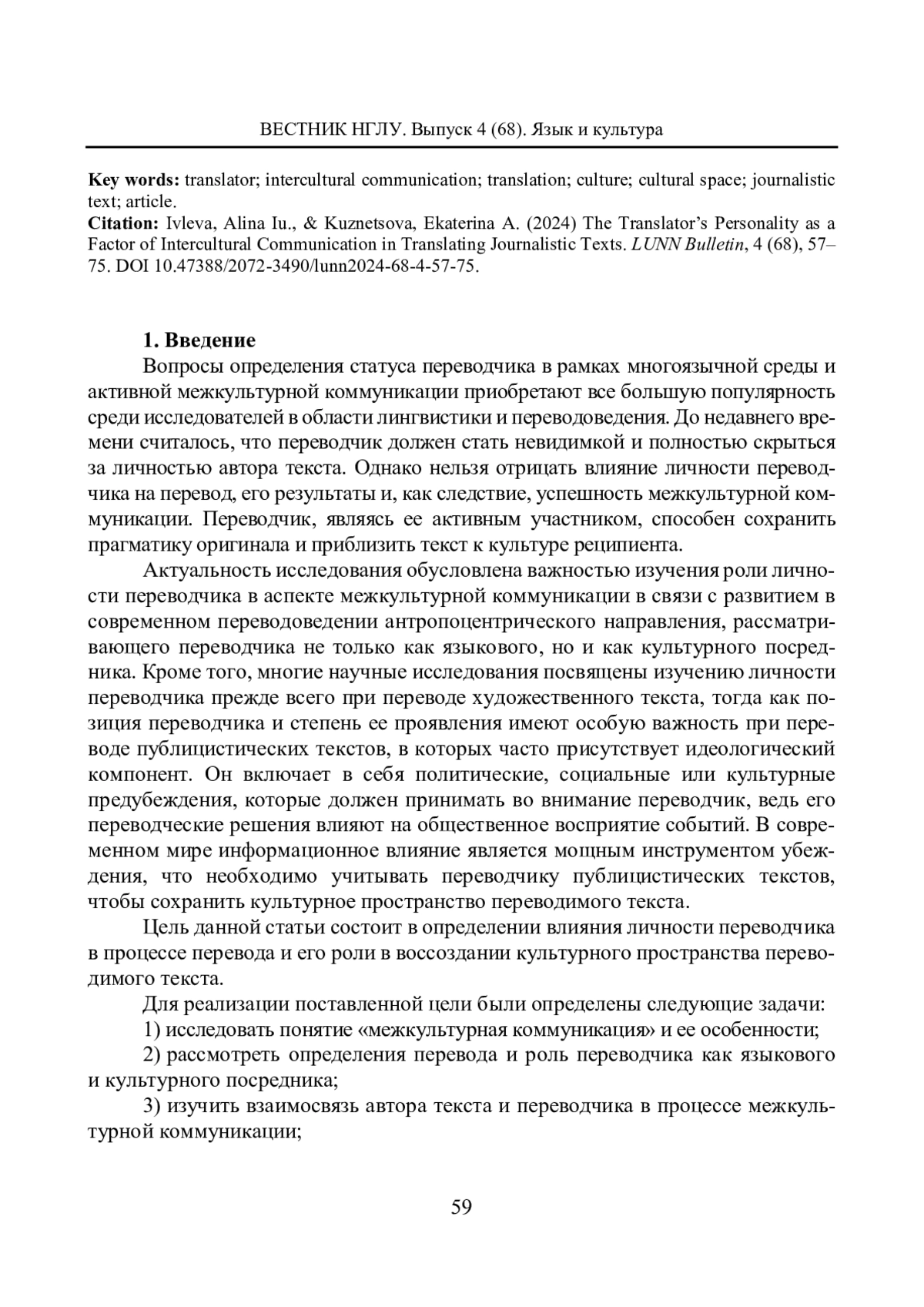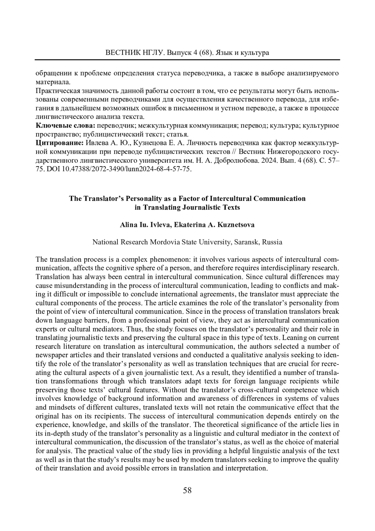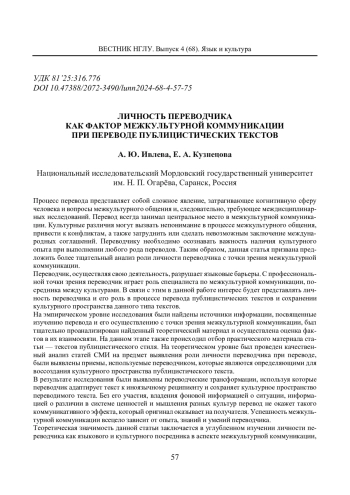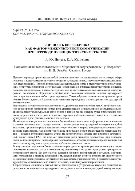 ИВЛЕВА А. Ю., КУЗНЕЦОВА Е. А. ЛИЧНОСТЬ ПЕРЕВОДЧИКА КАК ФАКТОР МЕЖКУЛЬТУРНОЙ КОММУНИКАЦИИ ПРИ ПЕРЕВОДЕ ПУБЛИЦИСТИЧЕСКИХ ТЕКСТОВ // ВЕСТНИК НИЖЕГОРОДСКОГО ГОСУДАРСТВЕННОГО ЛИНГВИСТИЧЕСКОГО УНИВЕРСИТЕТА ИМ. Н. А. ДОБРОЛЮБОВА. 2024. № 68