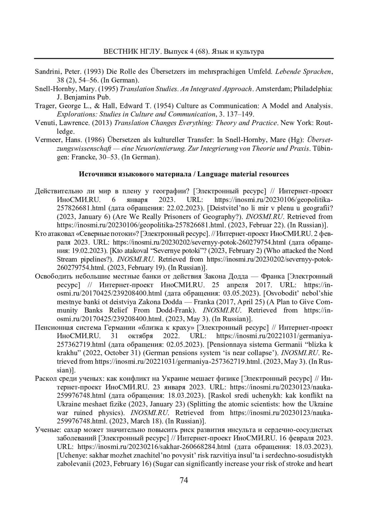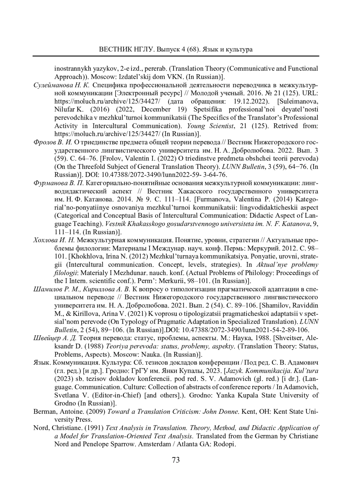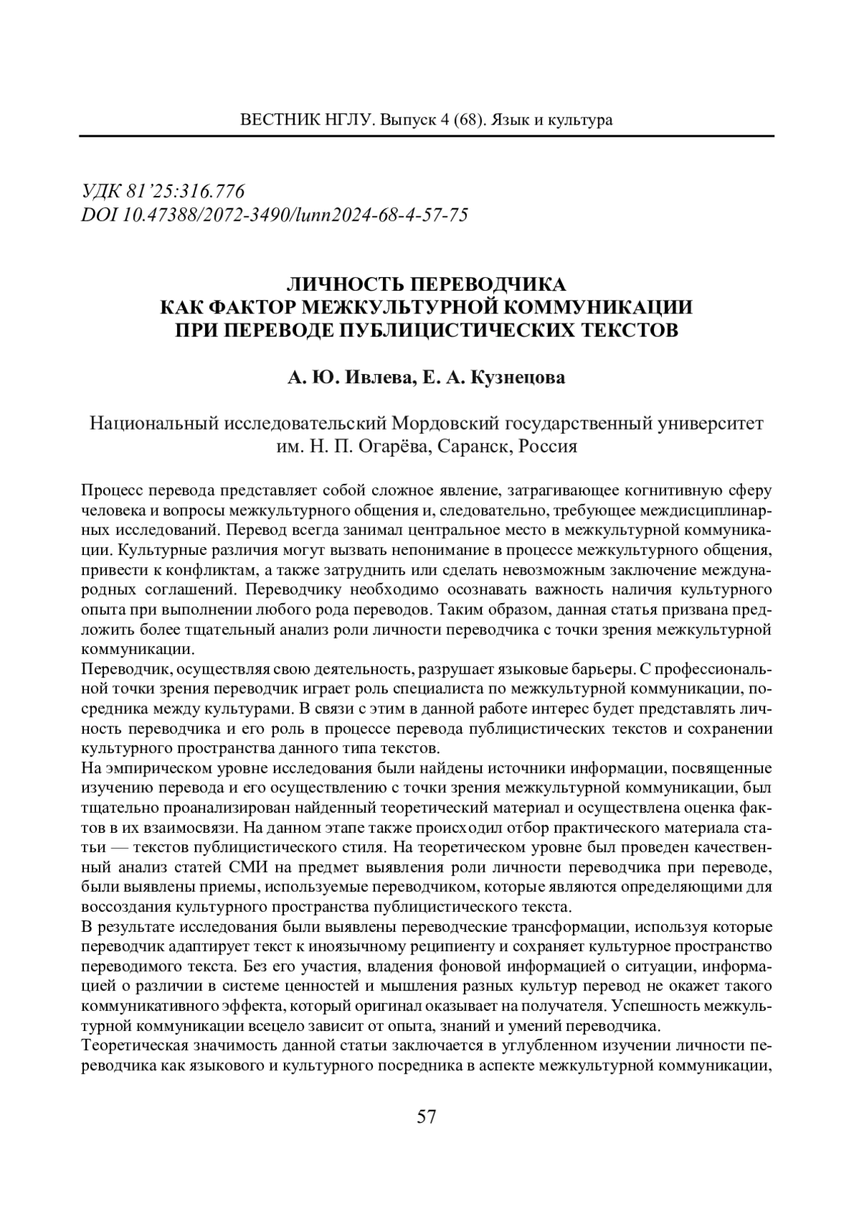 ИВЛЕВА А. Ю., КУЗНЕЦОВА Е. А. ЛИЧНОСТЬ ПЕРЕВОДЧИКА КАК ФАКТОР МЕЖКУЛЬТУРНОЙ КОММУНИКАЦИИ ПРИ ПЕРЕВОДЕ ПУБЛИЦИСТИЧЕСКИХ ТЕКСТОВ // ВЕСТНИК НИЖЕГОРОДСКОГО ГОСУДАРСТВЕННОГО ЛИНГВИСТИЧЕСКОГО УНИВЕРСИТЕТА ИМ. Н. А. ДОБРОЛЮБОВА. 2024. № 68