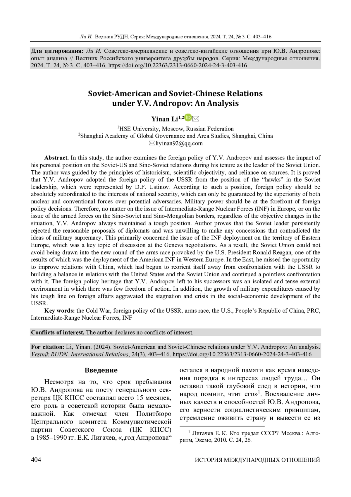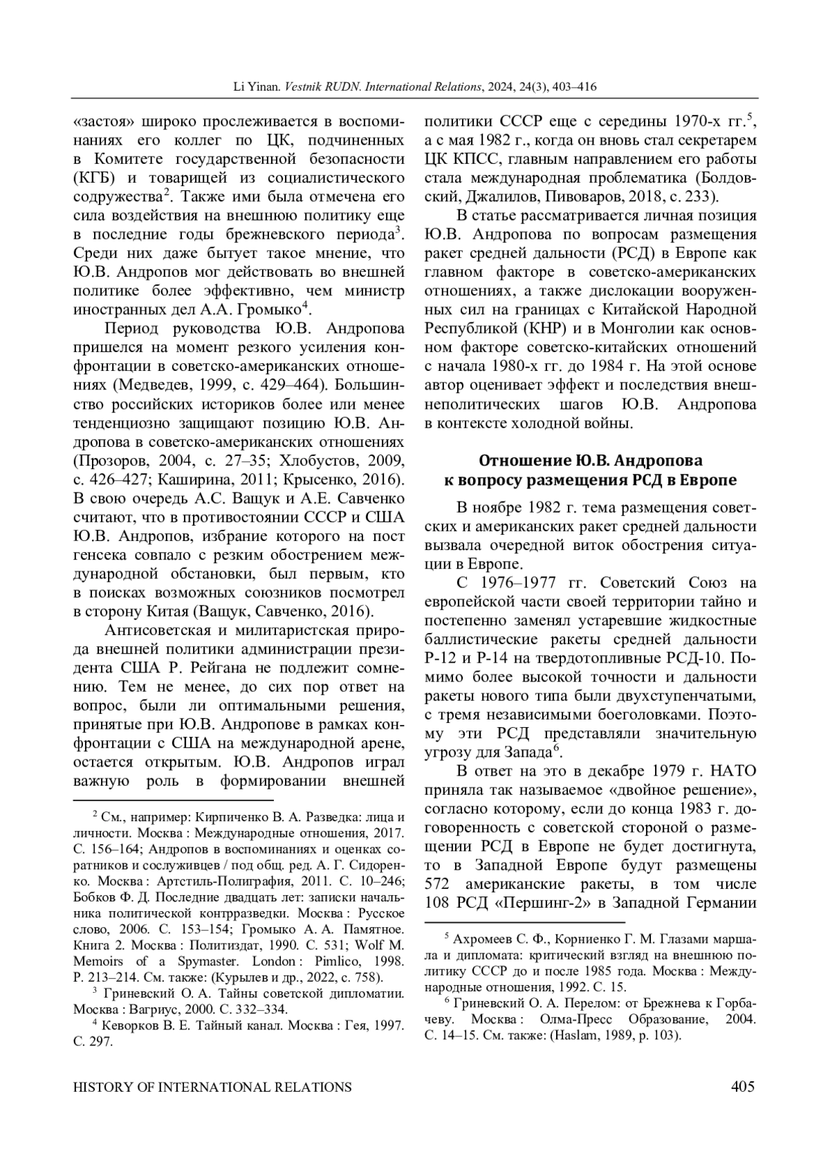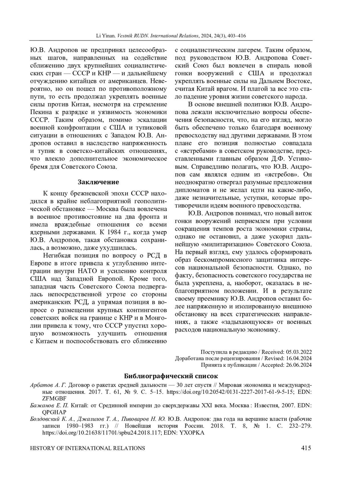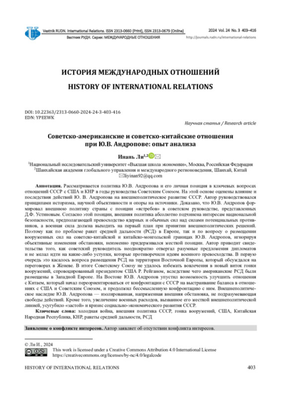 Рассматривается политика Ю. В. Андропова и его личная позиция в ключевых вопросах отношений СССР с США и КНР в годы руководства Советским Союзом. На этой основе оценены влияние и последствия действий Ю. В. Андропова на внешнеполитическое развитие СССР. Автор руководствовался принципами историзма, научной объективности и опоры на источники. Доказано, что Ю. В. Андропов формировал внешнюю политику страны с позиции «ястребов» в советском руководстве, представленных Д. Ф. Устиновым. Согласно этой позиции, внешняя политика абсолютно подчинена интересам национальной безопасности, предполагающей превосходство ядерных и обычных сил над силами потенциальных противников, а военная сила должна выходить на первый план при принятии внешнеполитических решений. Поэтому как по проблеме ракет средней дальности (РСД) в Европе, так и по вопросу о размещении вооруженных сил на советско-китайской и китайско-монгольской границах Ю. В. Андропов, игнорируя объективные изменения обстановки, неизменно придерживался жесткой позиции. Автор приводит свидетельства того, как советский руководитель неоднократно отвергал разумные предложения дипломатов и не желал идти на какие-либо уступки, которые противоречили идеям военного превосходства. В первую очередь это касалось вопроса размещения РСД на территории Восточной Европы, который обсуждался на переговорах в Женеве. В итоге Советскому Союзу не удалось избежать вовлечения в новый виток гонки вооружений, спровоцированный президентом США Р. Рейганом, вследствие чего американские РСД были размещены в Западной Европе. На Востоке Ю. В. Андропов упустил возможность улучшить отношения с Китаем, который начал переориентироваться от конфронтации с СССР на выстраивание баланса в отношениях с США и Советским Союзом, и продолжил бессмысленную конфронтацию с ним. Внешнеполитическое наследие Ю. В. Андропова - изолированная, напряженная внешняя обстановка, не подразумевающая свободы действий. Кроме того, увеличение военных расходов, вызванное его жесткой внешнеполитической линией, усугубило «застой» и кризис социально-экономического развития СССР.