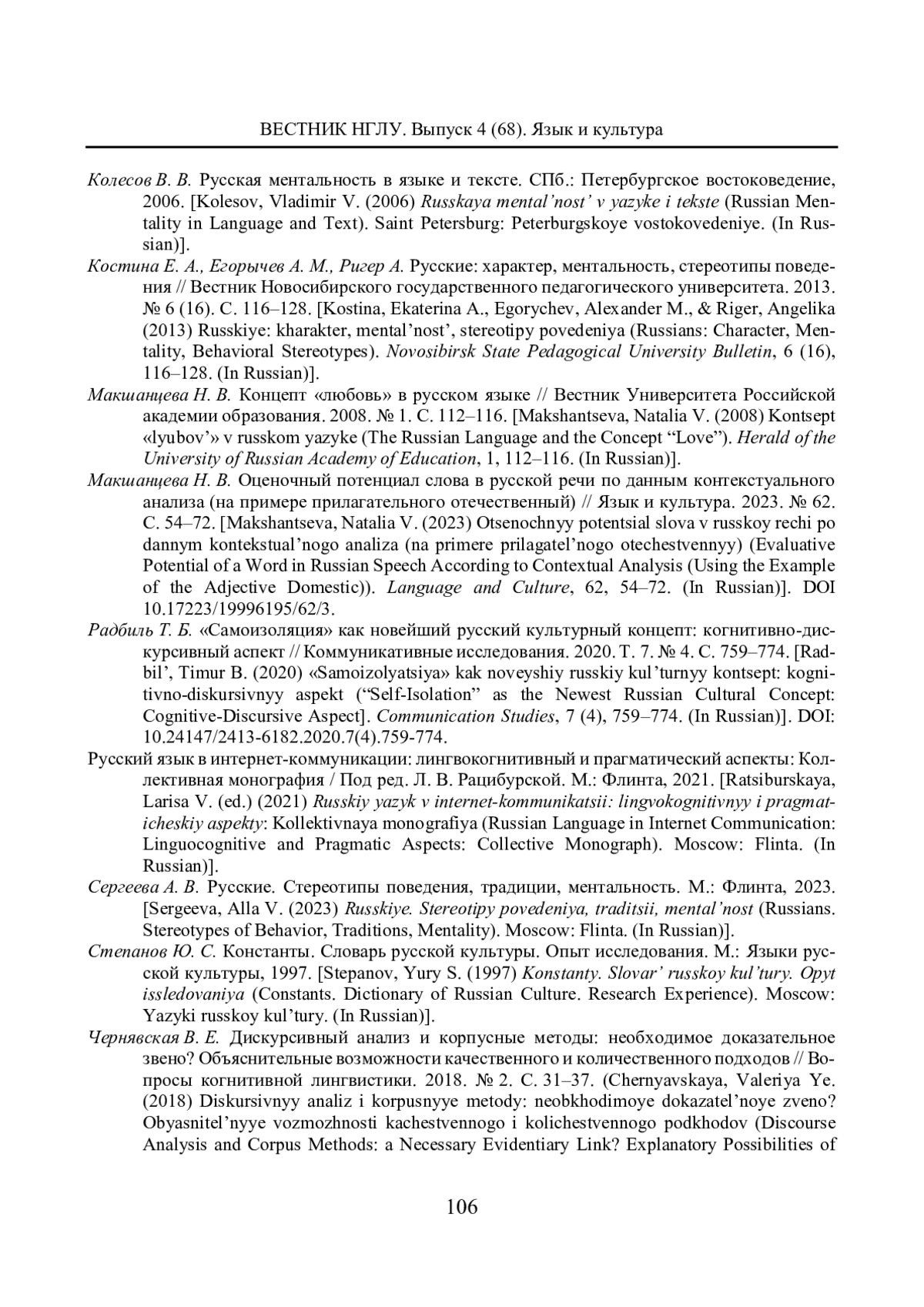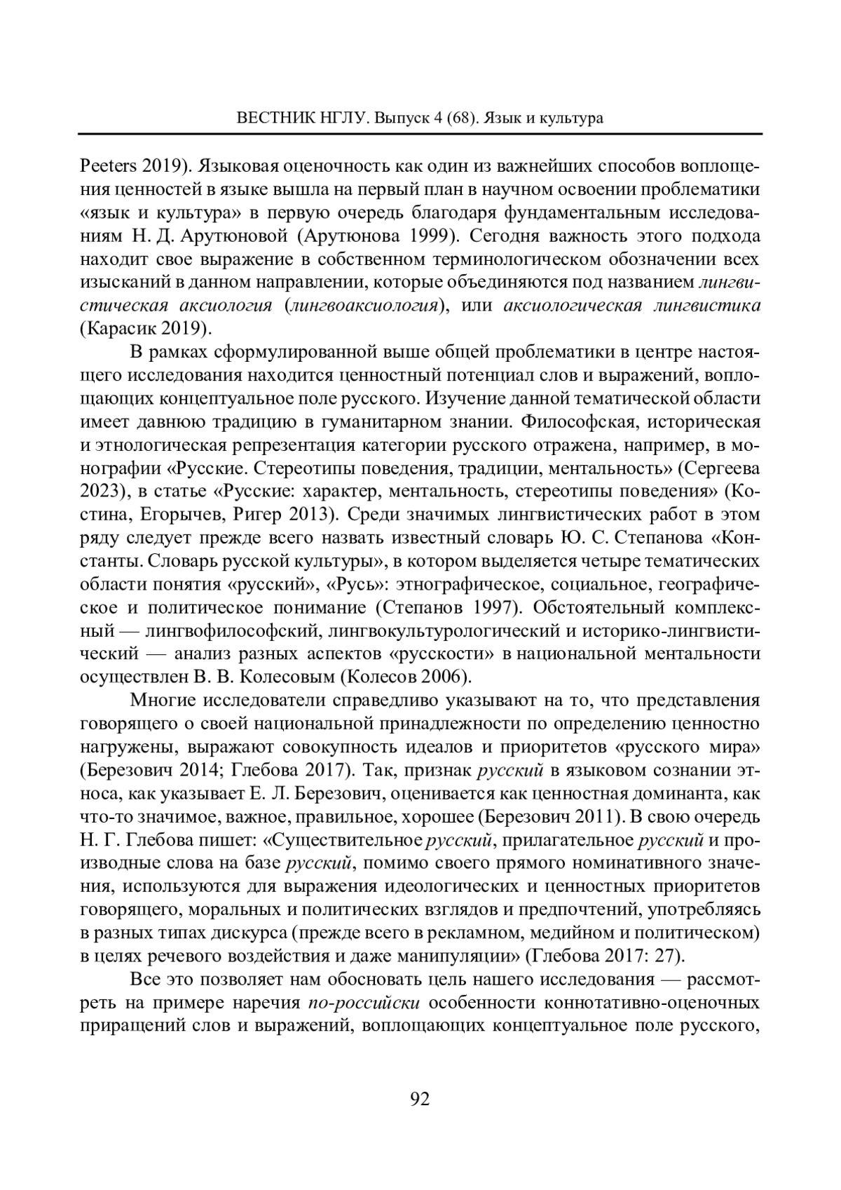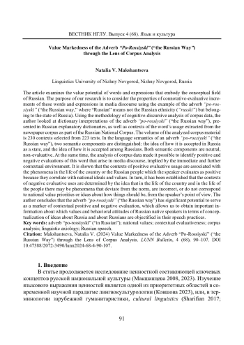 МАКШАНЦЕВ Н. В. ЦЕННОСТНАЯ МАРКИРОВАННОСТЬ НАРЕЧИЯ ПО-РОССИЙСКИ В СВЕТЕ КОРПУСНОГО АНАЛИЗА // ВЕСТНИК НИЖЕГОРОДСКОГО ГОСУДАРСТВЕННОГО ЛИНГВИСТИЧЕСКОГО УНИВЕРСИТЕТА ИМ. Н. А. ДОБРОЛЮБОВА. 2024. № 68