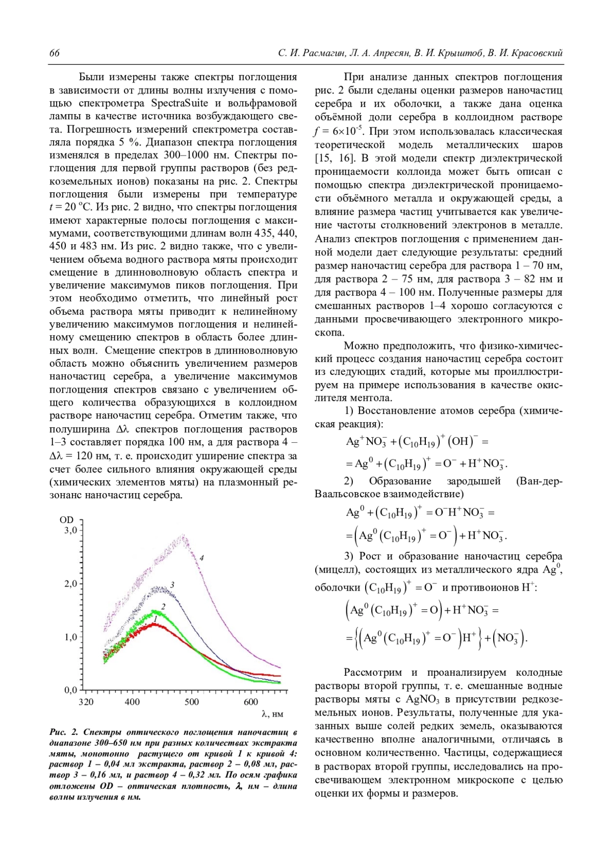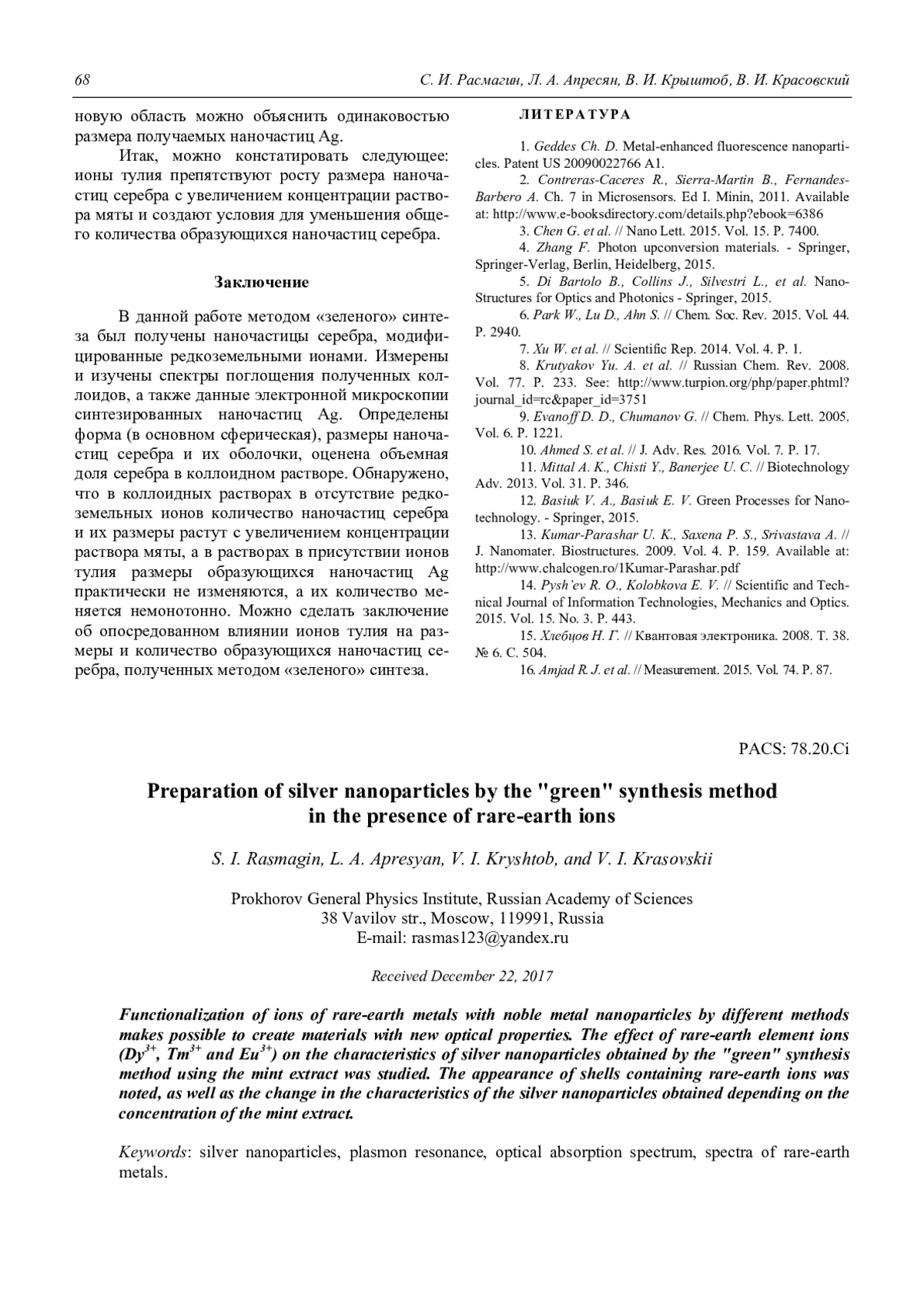 Расмагин С. И., Апресян Л. А., Крыштоб В. И., Красовский В. И. Получение наночастиц серебра методом «зеленого» синтеза в присутствии редкоземельных ионов 64
