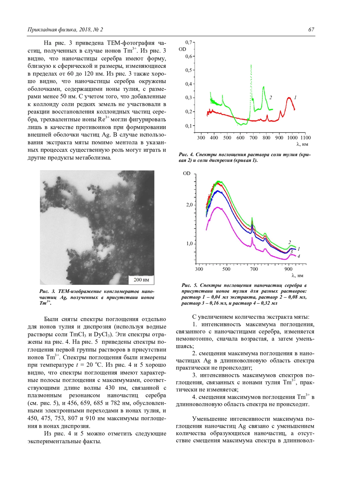 В данной работе методом «зеленого» синтеза был получены наночастицы серебра, модифицированные редкоземельными ионами. Измерены и изучены спектры поглощения полученных коллоидов, а также данные электронной микроскопии синтезированных наночастиц Ag. Определены форма (в основном сферическая), размеры наночастиц серебра и их оболочки, оценена объемная доля серебра в коллоидном растворе. Обнаружено, что в коллоидных растворах в отсутствие редкоземельных ионов количество наночастиц серебра и их размеры растут с увеличением концентрации раствора мяты, а в растворах в присутствии ионов тулия размеры образующихся наночастиц Ag практически не изменяются, а их количество меняется немонотонно. Можно сделать заключение об опосредованном влиянии ионов тулия на размеры и количество образующихся наночастиц серебра, полученных методом «зеленого» синтеза.
