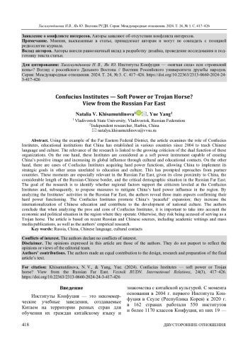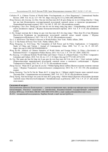 3. Byankin, K. Yu. (2014). Confucius Institute and its place in cultural globalization and cultural regionalization of PRC. Rossiya i Kitai: Problemy Strategicheskogo Vzaimodeistviya: Sbornik Vostochnogo Tsentra, (15), 145-149. (In Russian). EDN: SXKNQT