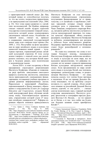 19. Selezneva, N. V. (2021). Confucius Institutes as a tool of China’s “soft power”: Problems and prospects of development in a new era. China in World and Regional Politics. History and Modernity, 26(26), 291-305. (In Russian). ;. DOI: 10.24412/2618-6888-2021-26-291-305 EDN: PDFMUV