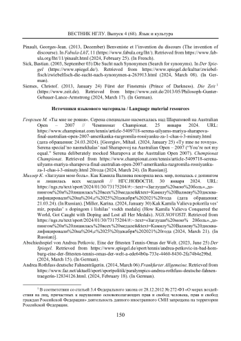 5. Малышева Е. Г. Русский спортивный дискурс: теория и методология лингвокогнитивного исследования: Дис. … д-ра филол. наук: 10.02.01. Омск, 2011. EDN: QFLFCF
