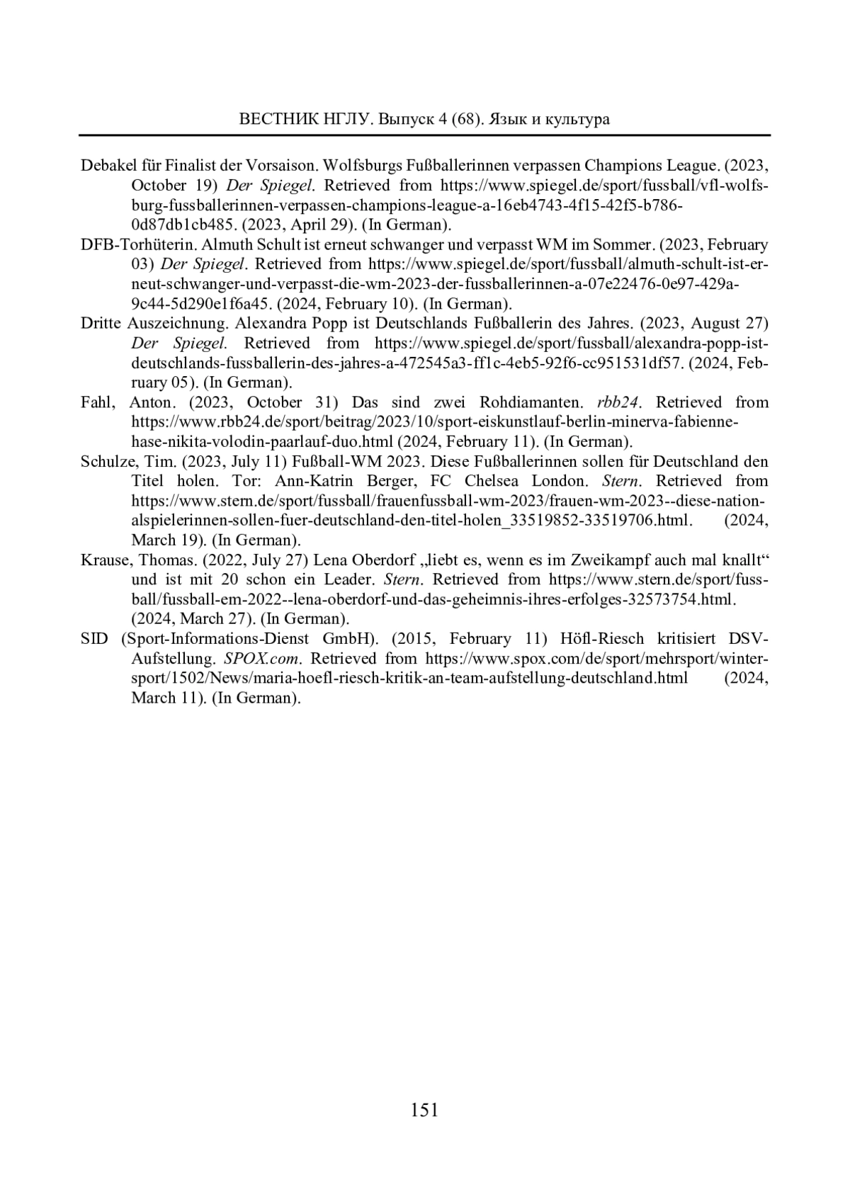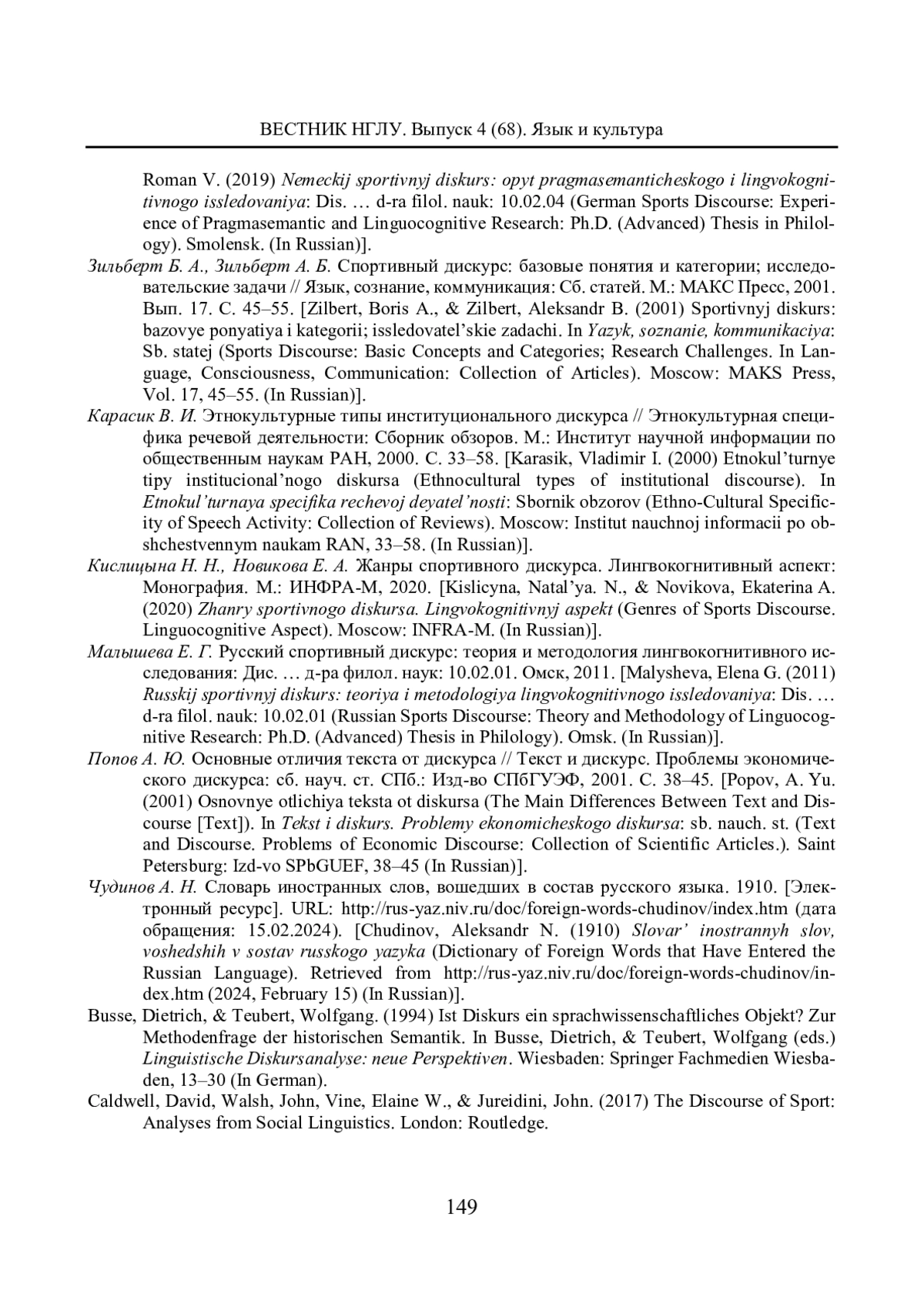 4. Кислицына Н. Н., Новикова Е. А. Жанры спортивного дискурса. Лингвокогнитивный аспект: Монография. М.: ИНФРА-М, 2020. EDN: RCFIAI