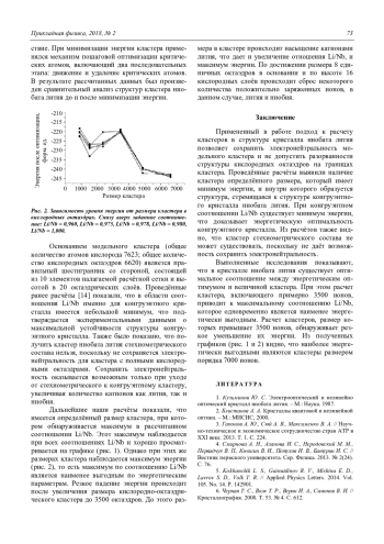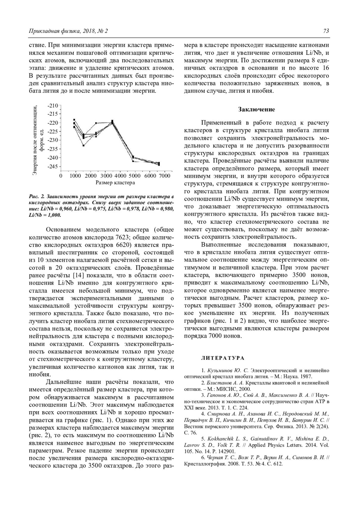 Примененный в работе подход к расчету кластеров в структуре кристалла ниобата лития позволяет сохранить электронейтральность модельного кластера и не допустить разорванности структуры кислородных октаэдров на границах кластера. Проведённые расчёты выявили наличие кластера определённого размера, который имеет минимум энергии, и внутри которого образуется структура, стремящаяся к структуре конгруэнтного кристалла ниобата лития. При конгруэнтном соотношении Li/Nb существует минимум энергии, что доказывает энергетическую оптимальность конгруэнтного кристалла. Из расчётов также видно, что кластер стехиометрического состава не может существовать, поскольку не даёт возможность сохранить электронейтральность. Выполненные исследования показывают, что в кристалле ниобата лития существует оптимальное соотношение между энергетическим оптимумом и величиной кластера. При этом расчет кластера, включающего примерно 3500 ионов, приводит к максимальному соотношению Li/Nb, которое одновременно является наименее энергетически выгодным. Расчет кластеров, размер которых превышает 3500 ионов, обнаруживает резкое уменьшение их энергии. Из полученных графиков (рис. 1 и 2) видно, что наиболее энергетически выгодными являются кластеры размером порядка 7000 ионов.