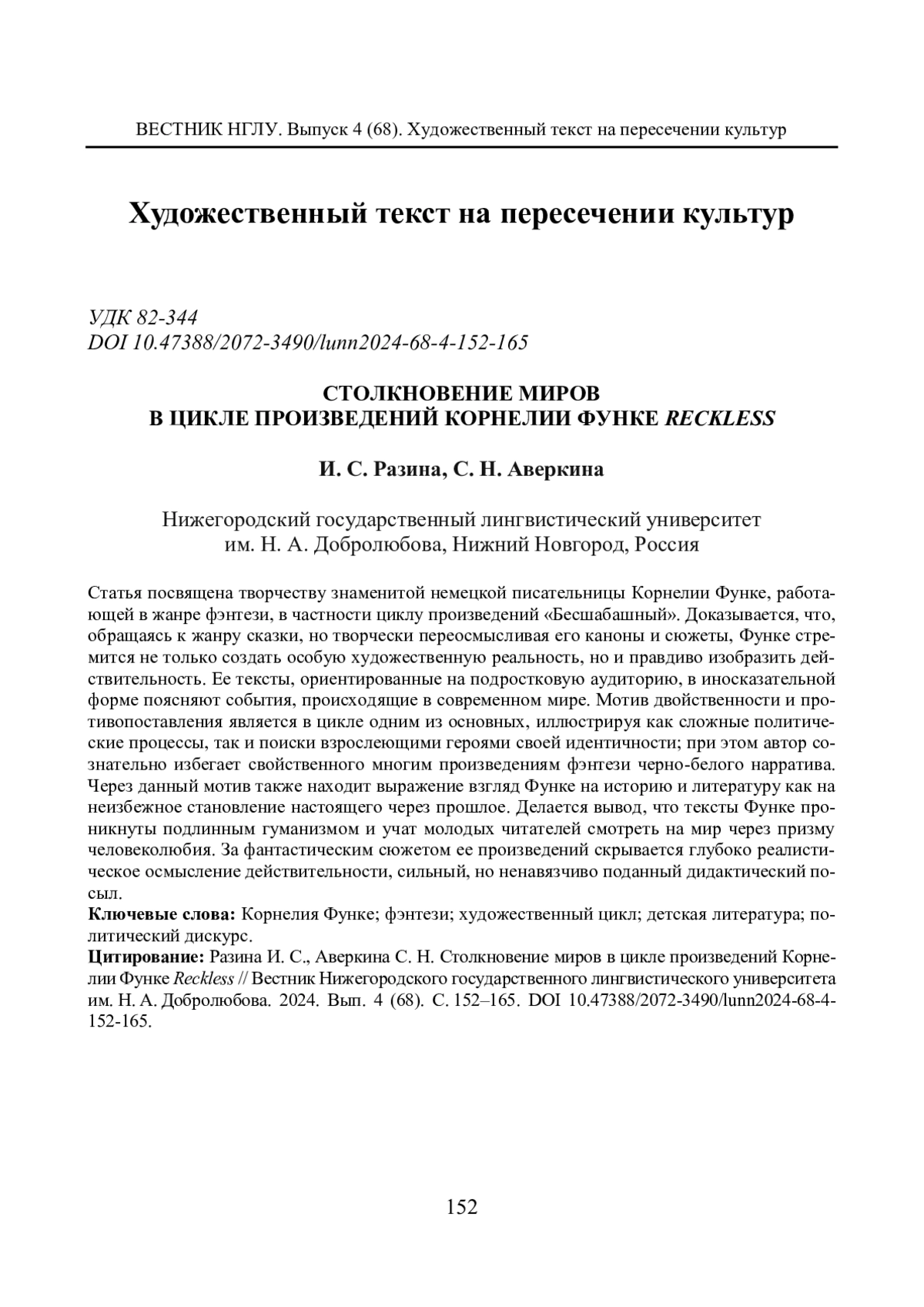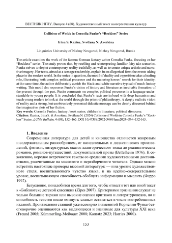 РАЗИНА И. С., АВЕРКИНА С. Н. СТОЛКНОВЕНИЕ МИРОВ В ЦИКЛЕ ПРОИЗВЕДЕНИЙ КОРНЕЛИИ ФУНКЕ RECKLESS // ВЕСТНИК НИЖЕГОРОДСКОГО ГОСУДАРСТВЕННОГО ЛИНГВИСТИЧЕСКОГО УНИВЕРСИТЕТА ИМ. Н. А. ДОБРОЛЮБОВА. 2024. № 68
