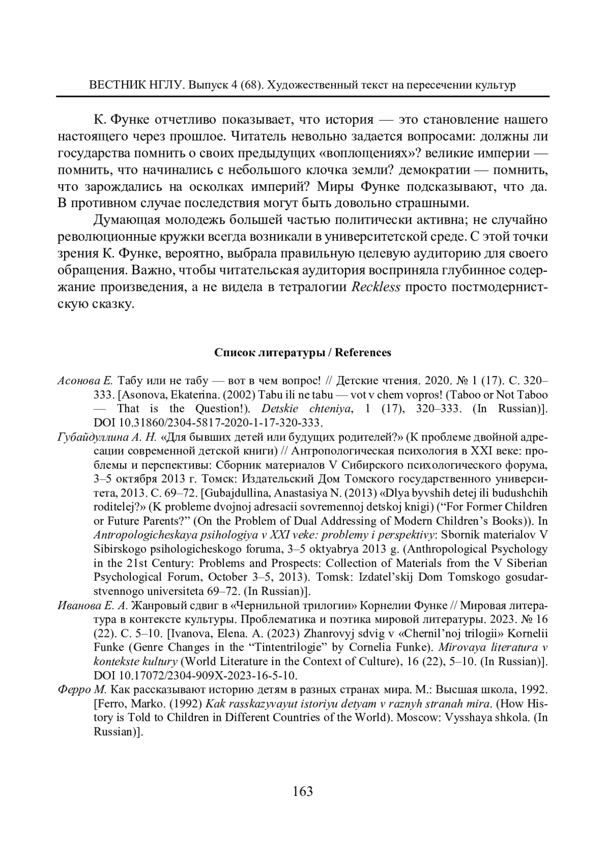 Статья посвящена творчеству знаменитой немецкой писательницы Корнелии Функе, работающей в жанре фэнтези, в частности циклу произведений «Бесшабашный». Доказывается, что, обращаясь к жанру сказки, но творчески переосмысливая его каноны и сюжеты, Функе стремится не только создать особую художественную реальность, но и правдиво изобразить действительность. Ее тексты, ориентированные на подростковую аудиторию, в иносказательной форме поясняют события, происходящие в современном мире. Мотив двойственности и противопоставления является в цикле одним из основных, иллюстрируя как сложные политические процессы, так и поиски взрослеющими героями своей идентичности; при этом автор сознательно избегает свойственного многим произведениям фэнтези черно-белого нарратива. Через данный мотив также находит выражение взгляд Функе на историю и литературу как на неизбежное становление настоящего через прошлое. Делается вывод, что тексты Функе проникнуты подлинным гуманизмом и учат молодых читателей смотреть на мир через призму человеколюбия. За фантастическим сюжетом ее произведений скрывается глубоко реалистическое осмысление действительности, сильный, но ненавязчиво поданный дидактический посыл.