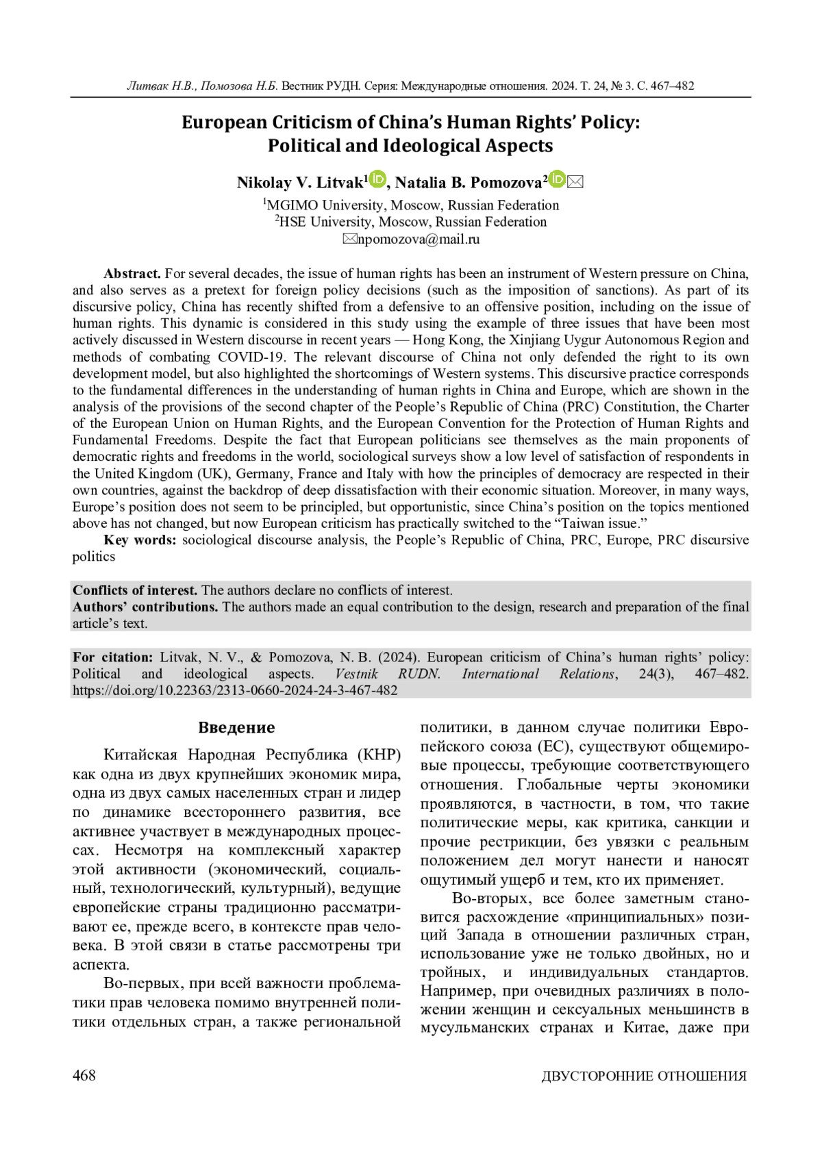 Тема прав человека на протяжении нескольких десятилетий представляет собой инструмент давления Запада на Китай, а также служит оправданием внешнеполитических решений (например, введения санкций). Китай в рамках своей дискурсивной политики в последнее время перешел от оборонительной позиции к наступательной, в том числе и по вопросу прав человека. Данная тенденция проанализирована в исследовании на примере трех тем, доминировавших в западном дискурсе в последние годы: Гонконг, Синьцзян-Уйгурский автономный район и методы борьбы с COVID-19. Дискурс Китая не только отстаивает право на собственную модель развития, но и активно указывает на недостатки западных систем. Анализ положений второй главы Конституции КНР, Хартии Европейского союза по правам человека, а также Европейской конвенции о защите прав человека и основных свобод позволил авторам выявить ряд принципиальных отличий в понимании прав человека в Китае и Европе. Несмотря на то что европейские политики позиционируют себя в качестве главных проводников демократических прав и свобод в мире, социологические опросы показывают низкий уровень удовлетворенности респондентов в Великобритании, Германии, Франции и Италии своим экономическим положением, а также тем, как соблюдаются принципы демократии в их странах. Кроме того, установлено, что во многом позиция Европы представляется не принципиальной, а конъюнктурной, поскольку по рассматриваемым темам позиции Китая не изменились, но теперь европейская критика сфокусировалась на «тайваньском вопросе».