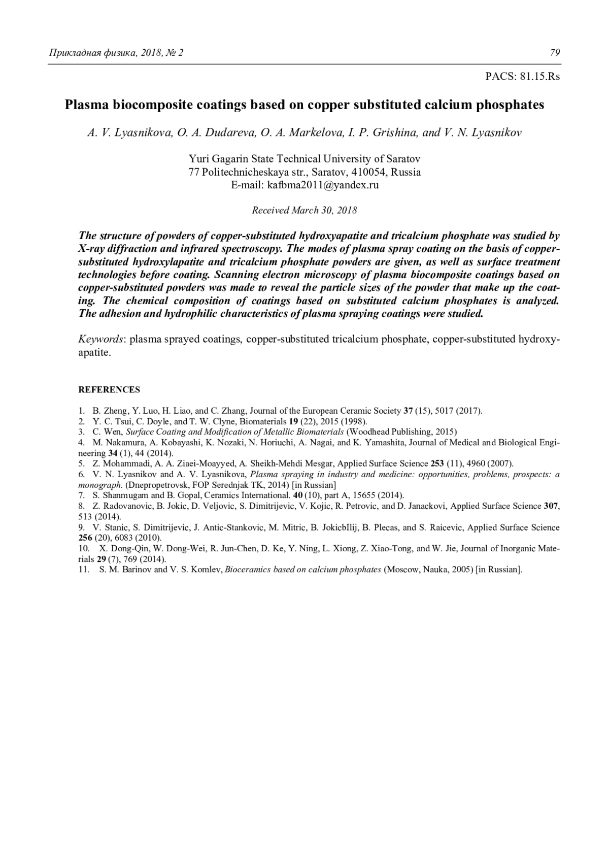 A. V. Lyasnikova, O. A. Dudareva, O. A. Markelova, I. P. Grishina, and V. N. Lyasnikov Plasma biocomposite coatings based on copper substituted calcium phosphates 75