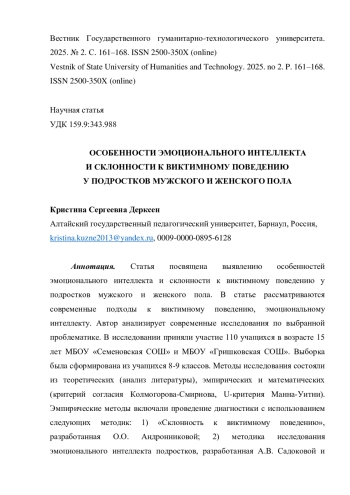 Статья посвящена выявлению особенностей эмоционального интеллекта и склонности к виктимному поведению у подростков мужского и женского пола. В статье рассматриваются современные подходы к виктимному поведению, эмоциональному интеллекту. Автор анализирует современные исследования по выбранной проблематике. В исследовании приняли участие 110 учащихся в возрасте 15 лет МБОУ «Семеновская СОШ» и МБОУ «Гришковская СОШ». Выборка была сформирована из учащихся 8-9 классов. Методы исследования состояли из теоретических (анализ литературы), эмпирических и математических (критерий согласия Колмогорова-Смирнова, U-критерия Манна-Уитни). Эмпирические методы включали проведение диагностики с использованием следующих методик: 1) «Склонность к виктимному поведению», разработанная О. О. Андронниковой; 2) методика исследования эмоционального интеллекта подростков, разработанная А. В. Садоковой и П. М. Воронкиной. Для проведения сравнительного анализа выборка была разделена на группы по полу (группа 1 - мальчики, группа 2 - девочки). Полученные данные позволяют сделать вывод о наличии половых различий в склонности к разного рода виктимному поведению, в развитии эмоционального интеллекта и отдельных его параметров. Выявленные данные могут быть использованы для составления программ сопровождения, направленных на снижение склонности к виктимному поведению и развитие эмоционального интеллекта у мальчиков и девочек подросткового возраста.