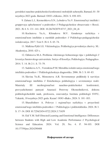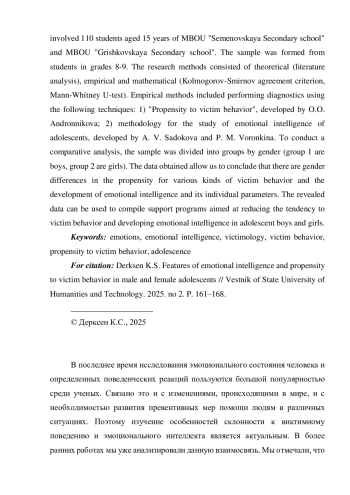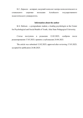 8. Дерксен К.С. Развитие эмоционального интеллекта как средство профилактики рискованного поведения подростка // Молодежь - Барнаулу: Материалы XXV городской научно-практической конференции молодых ученых, Барнаул, 01-30 ноября 2023 года. Барнаул: ООО “Алком”, 2024. С. 850-851. EDN: WLYVOU