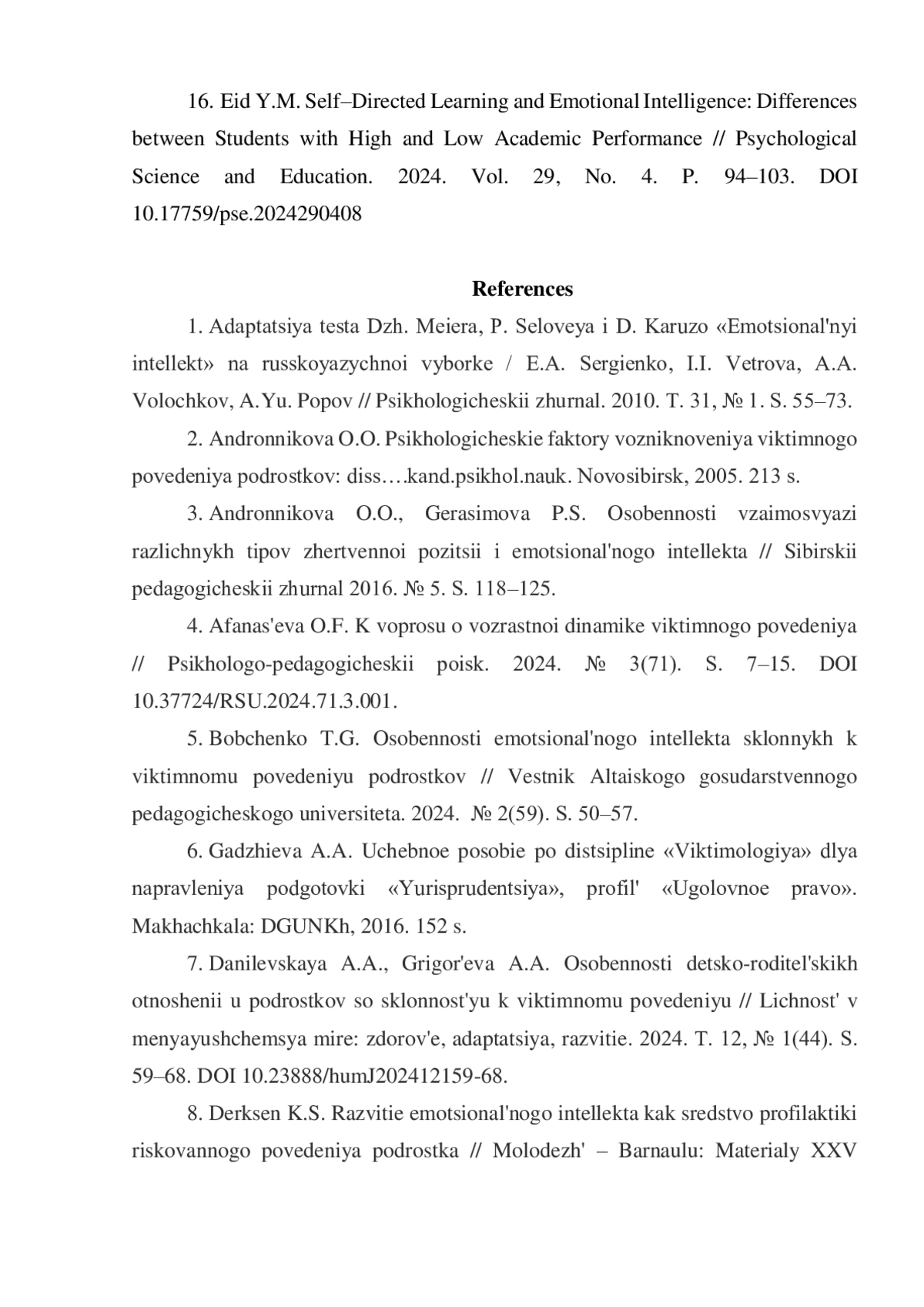 5. Бобченко Т.Г. Особенности эмоционального интеллекта склонных к виктимному поведению подростков // Вестник Алтайского государственного педагогического университета. 2024. № 2(59). С. 50-57.