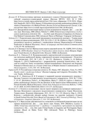 4. Дугалич Н. М. Конститутивные признаки медицинского плаката [Электронный ресурс] // Российский социально-гуманитарный журнал (Вестник МГОУ). 2023. № 4. URL: https://www.evestnik-mgou.ru/jour/article/view/1366 (дата обращения 15.01.2024).