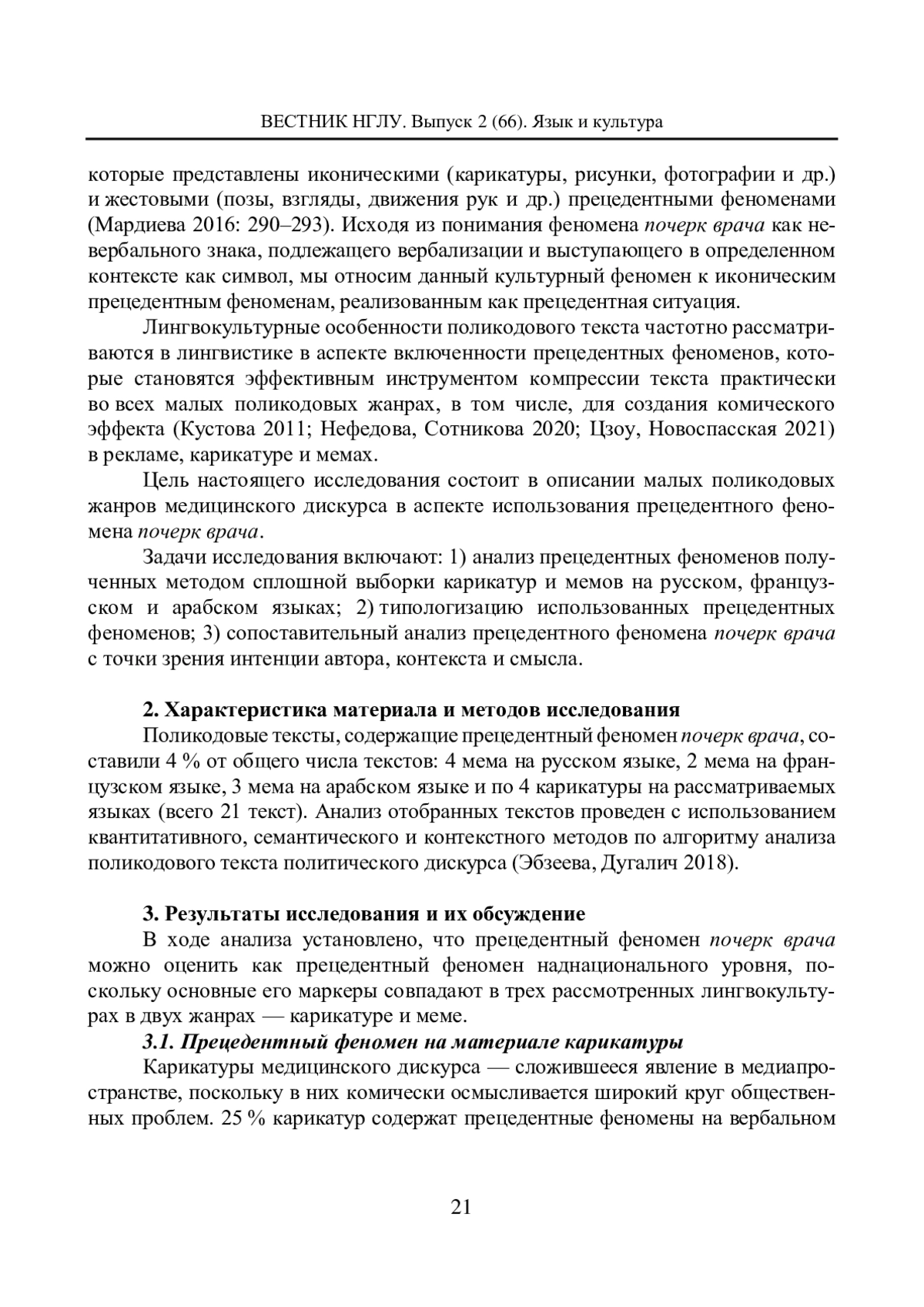 Жанровое своеобразие медицинского дискурса остается актуальным направлением в современной лингвистике. Исследования ведутся в области изучения монокодовых и поликодовых текстов различных жанров (Косицкая, Матюхин 2018; Дугалич 2023), коммуникативных стратегий (Жура 2008; Зубкова 2020), языковых средств, используемых в медицинском дискурсе (Ткачева 2022; Stepanova 2022). Принадлежность текстов разных жанров к медицинскому дискурсу определяется их содержанием (различные аспекты здоровья человека), формой (использованием лексических единиц, принадлежащих к лексико-тематическим группам болезнь, физиология, лекарство, гигиена, ЗОЖ и др.), участниками общения (преимущественно врач — пациент, врач — врач), включением терминов, символов (белый халат, красный крест, медицинские инструменты и оборудование и др.). Данное исследование посвящено почерку врача как прецедентному тексту в трех лингвокультурах и проведено на материале русского, французского и арабского языков. Общее число поликодовых текстов, которые были получены методом сплошной выборки из сети Интернет, — более 1300. Выбранные для анализа 600 текстов относятся к двум жанрам: карикатура и мем. Поликодовый текст (Новоспасская, Дугалич 2022) позволяет рассмотреть прецедентный характер данного феномена в двух рядах — визуальном и вербальном — и определить общее в его оценке в трех рассматриваемых лингвокультурах.