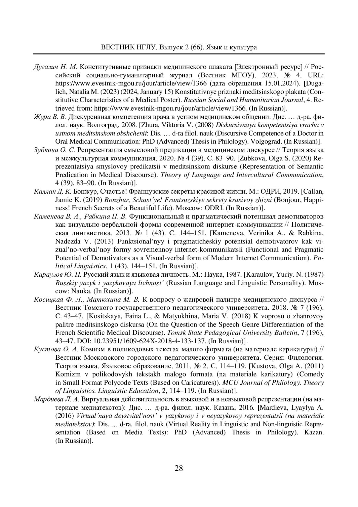 6. Зубкова О. С. Репрезентация смысловой предикации в медицинском дискурсе // Теория языка и межкультурная коммуникация. 2020. № 4 (39). С. 83-90. EDN: ZJYXXB