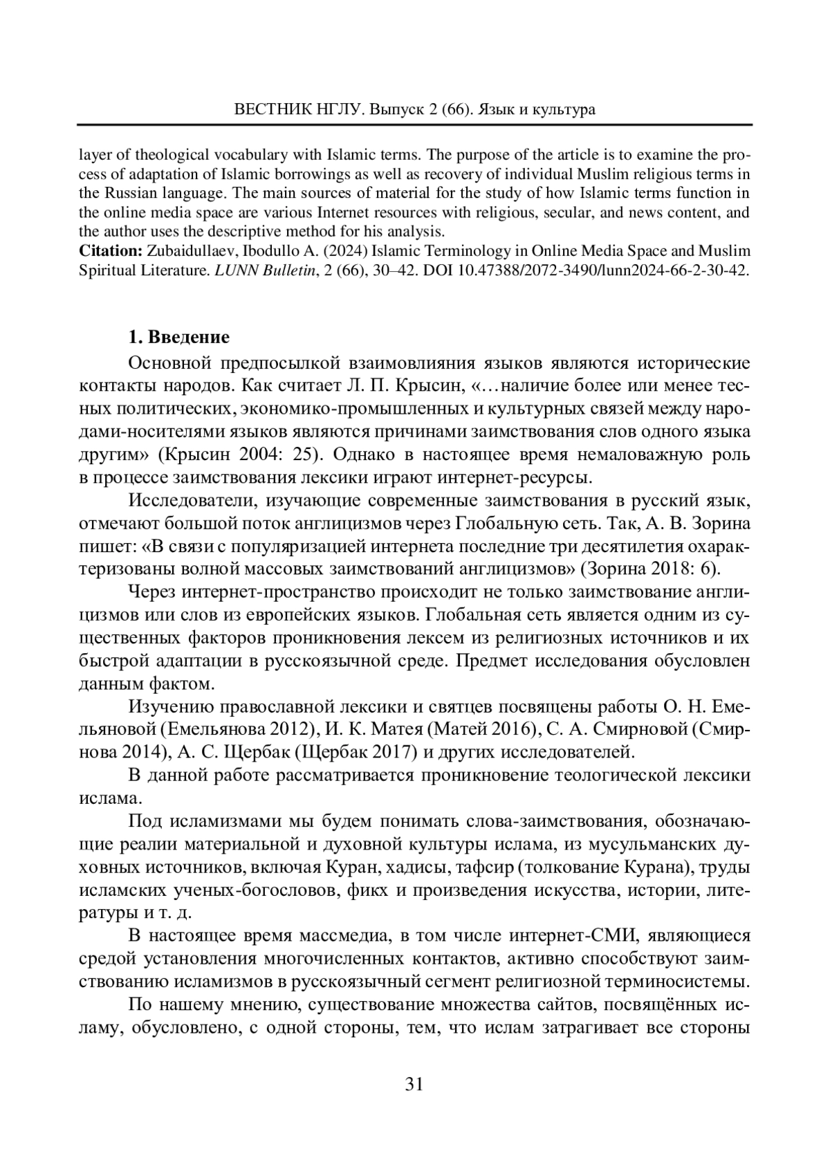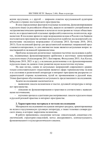 Основной предпосылкой взаимовлияния языков являются исторические контакты народов. Как считает Л. П. Крысин, «…наличие более или менее тесных политических, экономико-промышленных и культурных связей между народами-носителями языков являются причинами заимствования слов одного языка другим» (Крысин 2004: 25). Однако в настоящее время немаловажную роль в процессе заимствования лексики играют интернет-ресурсы. Исследователи, изучающие современные заимствования в русский язык, отмечают большой поток англицизмов через Глобальную сеть. Так, А. В. Зорина пишет: «В связи с популяризацией интернета последние три десятилетия охарактеризованы волной массовых заимствований англицизмов» (Зорина 2018: 6). Через интернет-пространство происходит не только заимствование англицизмов или слов из европейских языков. Глобальная сеть является одним из существенных факторов проникновения лексем из религиозных источников и их быстрой адаптации в русскоязычной среде. Предмет исследования обусловлен данным фактом.