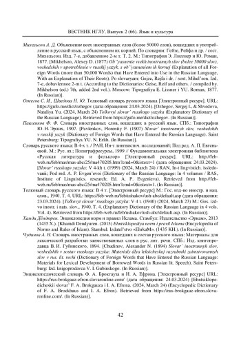 1. Александрова О. И. Многозначность заимствованных лексических единиц (на примере лексики арабского происхождения) [Электронный ресурс] // Вестник РУДН. Серия: Теория языка. Семиотика. Семантика. 2011. № 1. С. 46-49. EDN: PZEBOP