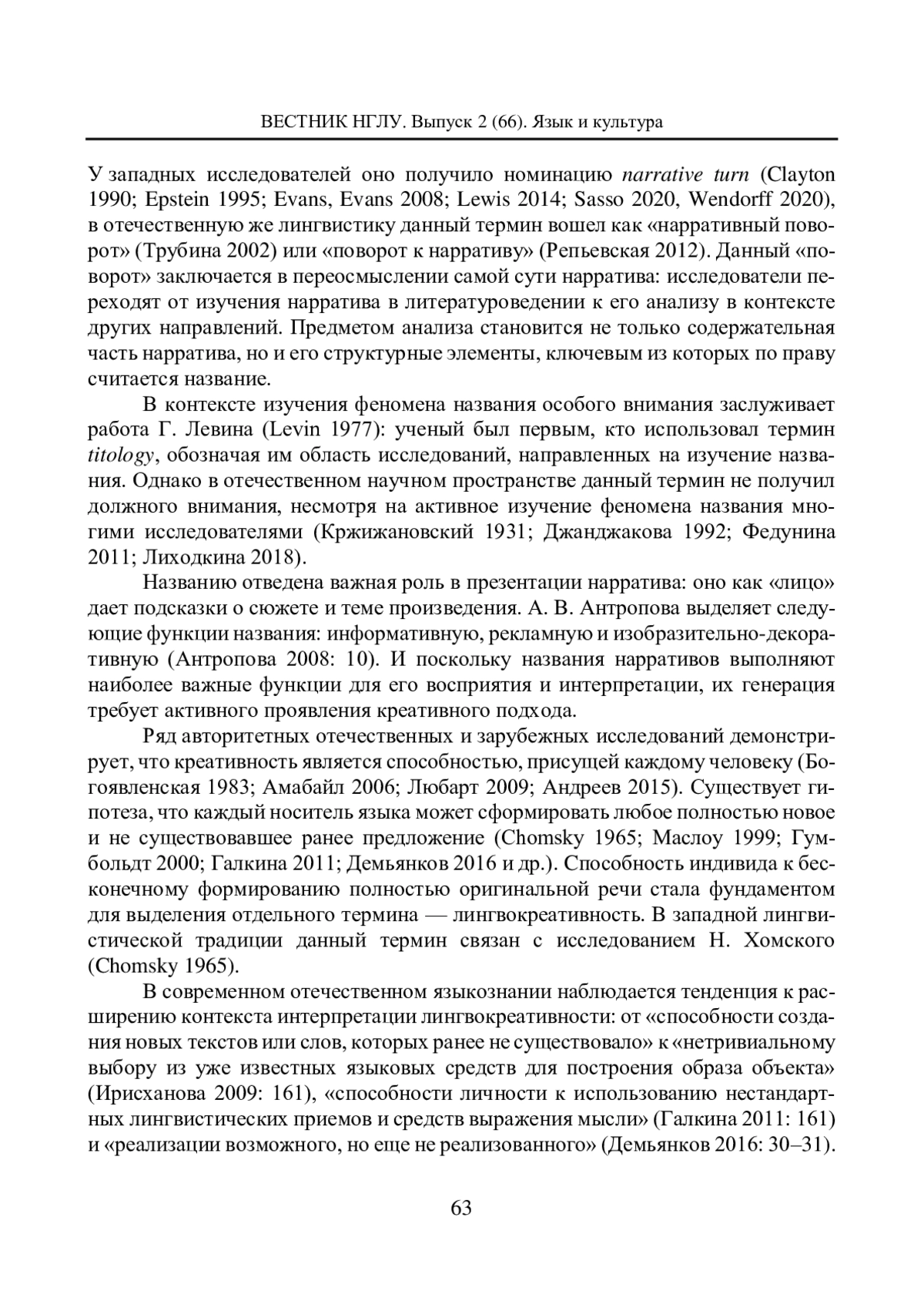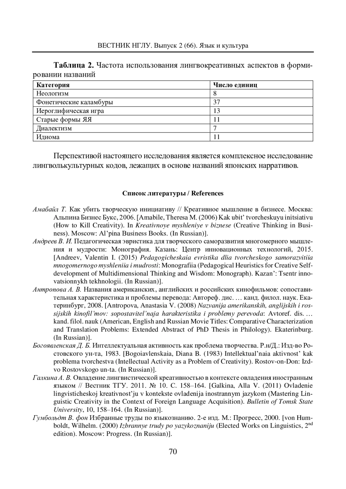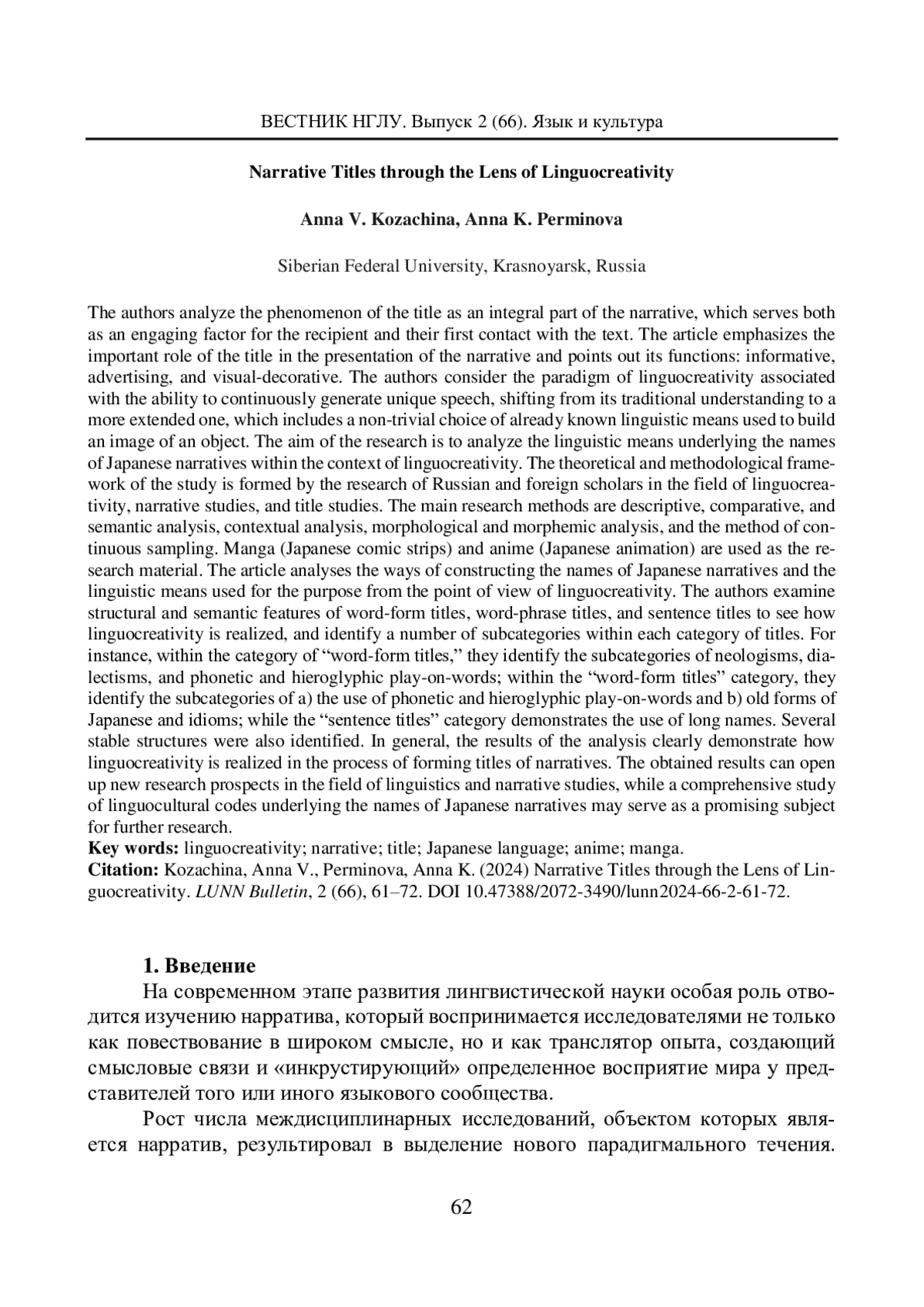 В статье анализируется феномен названия как неотъемлемой части нарратива, которая служит одновременно и вовлекающим фактором для реципиента, и его первым контактом с произведением. Выделяется важная роль названия в презентации нарратива, отмечаются его функции: информативная, рекламная и изобразительно-декоративная. Статья рассматривает концепцию лингвокреативности, связанную со способностью к бесконечному формированию оригинальной речи. Авторы переходят от традиционного понимания лингвокреативности к расширенному, включая нетривиальный выбор из уже известных языковых средств для построения образа объекта. Целью работы является анализ языковых средств, лежащих в основе названий японских нарративов в аспекте лингвокреативности. Теоретико-методологической базой работы являются труды отечественных и зарубежных ученых в области лингвокреативности, нарратива и названий. Основными методами исследования выступают описательный, сравнительно-сопоставительный, семантический анализ, контекстуальный анализ, морфологический и морфемный анализ и метод сплошной выборки. В качестве материала исследования использованы манга (японские комиксы) и аниме (японская анимация). В рамках статьи представлен анализ способов конструирования названий японских нарративов и использованных языковых средств с точки зрения лингвокреативности. Были изучены структурные и семантические особенности названий-словоформ, названий-словосочетаний и названий-предложений на предмет реализации лингвокреативности. В рамках каждой категории названий были уточнены подкатегории. Так, в категории «названия-словоформы» были выявлены подкатегории неологизмов, диалектизмов, фонетических каламбуров и иероглифической игры, в «названиях-словосочетаниях» - использование фонетических каламбуров, иероглифической игры, старых форм японского языка и идиом, а в «названиях-предложениях» - использование длинных названий. Также были выделены устойчивые формулы. В результате проведенного анализа выявлены способы реализации лингвокреативности в процессе формирования названий нарративов. Полученные результаты могут дать новые исследовательские перспективы в области языкознания и изучения нарратива. В качестве перспективы научного исследования авторы рассматривают комплексное исследование лингволькультурных кодов, лежащих в основе названий японских нарративов.