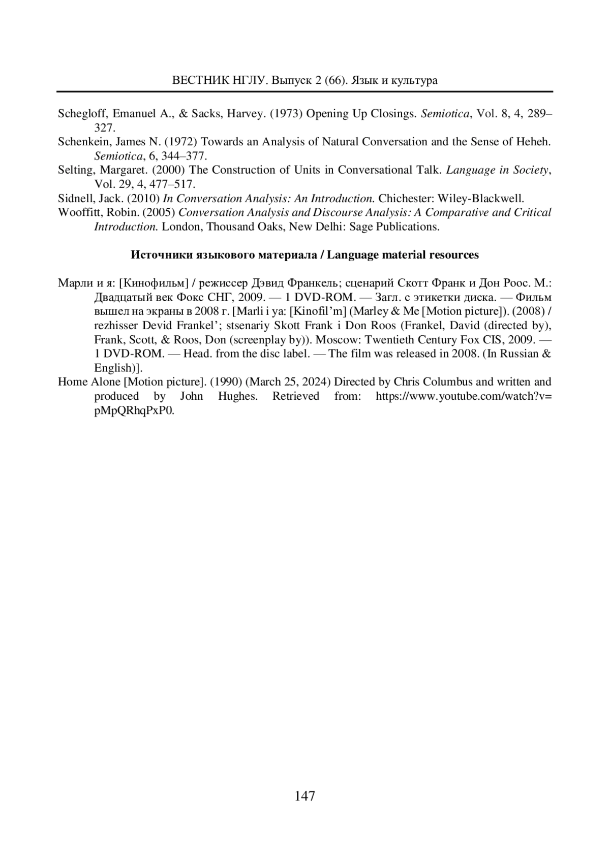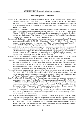 1. Бастун Е. В., Островская Т. А. Конверсационный анализ как метод анализа дискурса // Политическая лингвистика. 2020. № 4 (82). С. 40-46. EDN: CZSGSC
