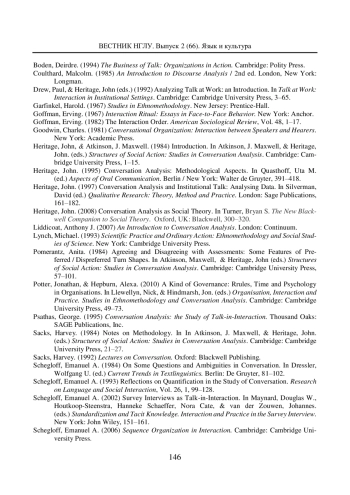 8. Сакс Х., Щеглофф Э., Джефферсон Г. Простейшая систематика организации очередности в разговоре / пер. с англ. А. М. Корбута // Социологическое обозрение. 2015. Т. 14. № 1. С. 142-202. EDN: TRRRAJ