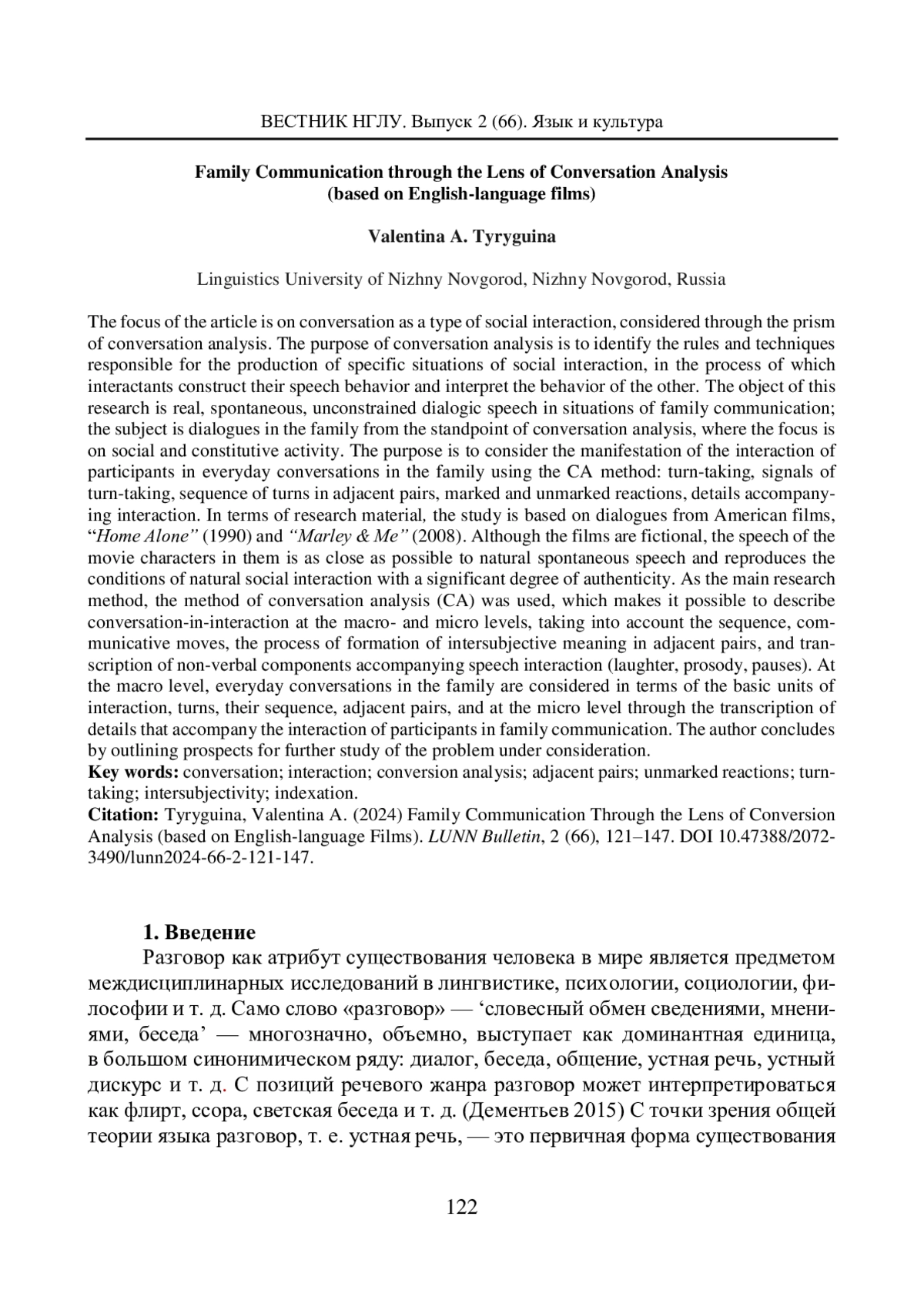 В фокусе внимания предлагаемой статьи находится разговор как вид социального взаимодействия, рассматриваемый через призму конверсационного анализа, цель которого — выявить правила и приемы, отвечающие за производство конкретных ситуаций социального взаимодействия, в процессе которого интерактанты конструируют свое речевое поведение и интерпретируют поведение другого. Объектом данного исследования является реальная, спонтанная, непринужденная диалогичная речь в ситуациях семейного общения, предметом — диалоги в семье с позиций конверсационного анализа (КА), где в центре внимания находится социально-конститутивная деятельность. Цель состоит в рассмотрении манифестации взаимодействия участников повседневных разговоров в семье с помощью метода КА: смена очереди, сигналы перехода очереди, последовательность ходов в смежных парах, маркированные и немаркированные реакции, детали, сопровождающие взаимодействие. Материалом исследования послужили диалоги из американских фильмов Home Alone (1990) и Marley & Me (2008). Хотя фильмы игровые, речь киногероев в них максимально приближена к естественной спонтанной речи и со значительной степенью достоверности воспроизводит условия естественного социального взаимодействия.