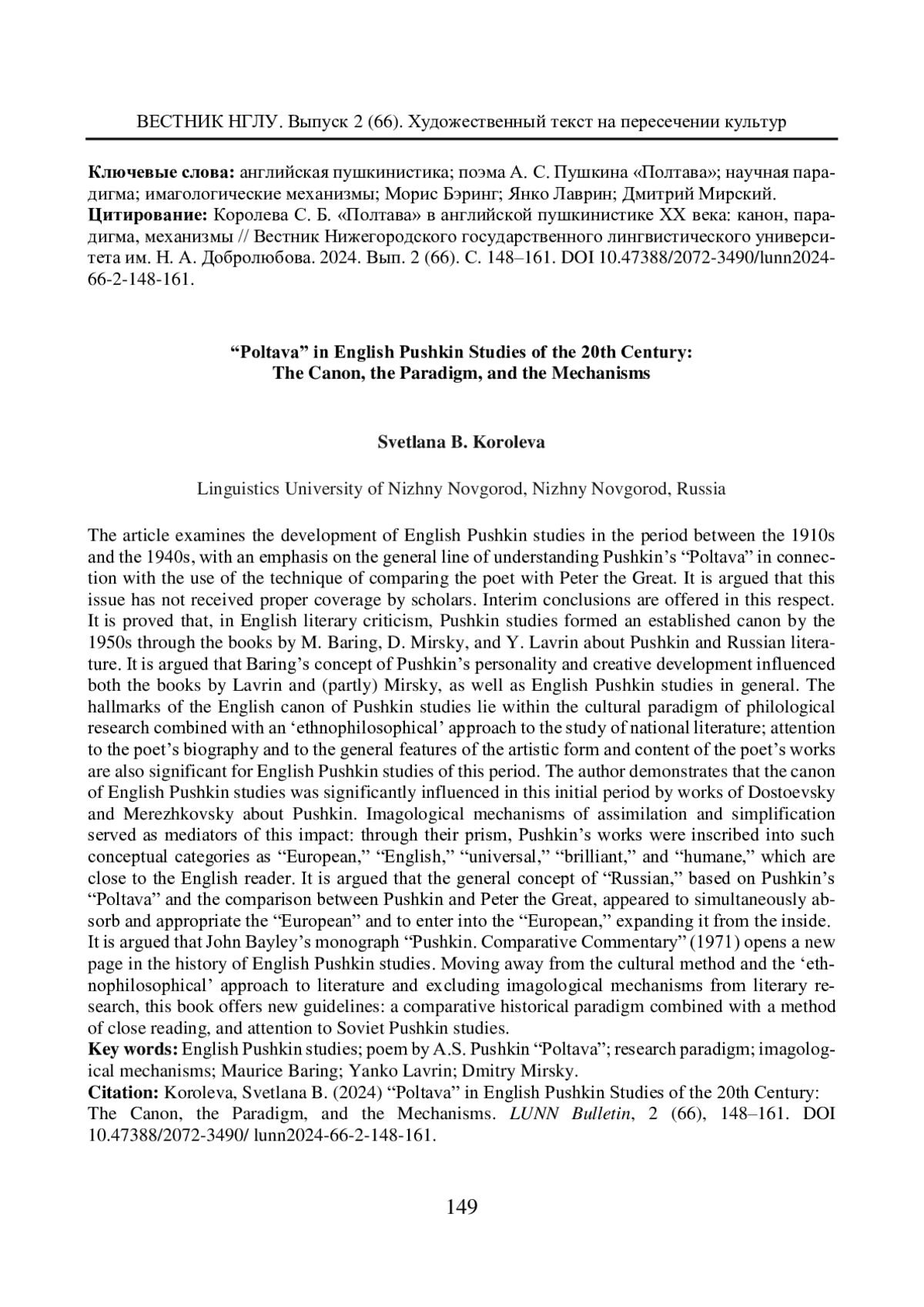 В статье исследуется становление английской пушкинистики в период 10-40-х гг. XX века с акцентом на общей линии осмысления «Полтавы» Пушкина в связи с применением приема сопоставления поэта с Петром I. Доказывается, что этот вопрос не получил должного научного освещения. Делаются промежуточные выводы относительно логики развития английской пушкинистики. Доказывается, что в форме устоявшегося канона она была сформирована к 1950-м гг. в научно-просветительских книгах М. Бэринга, Д. Мирского и Я. Лаврина о Пушкине и русской литературе. Утверждается, что концепция пушкинского творчества повлияла как на книги Лаврина и отчасти Мирского, так и на английскую пушкинистику в целом. Приметой английского пушкиноведческого канона стала культурно-историческая парадигма филологического исследования, совмещенная с этнофилософским подходом к изучению национальной литературы, вниманием к биографии поэта и к общим особенностям художественной формы и содержания произведения. Определено, что на становление канона английской пушкинистики значительное воздействие оказали работы Достоевского и Мережковского о Пушкине. Контекстом, опосредующим это воздействие, выступили имагологические механизмы уподобления и упрощения. С их помощью творчество Пушкина было вписано в такие близкие английскому читателю понятийные категории, как «европейское», «английское», «универсальное», «гениальное», «человечное». Выявлено, что «русское» на примере Пушкина (и Петра) представало одновременно вбирающим в себя «европейское», присваивающим его и - входящим в «европейское», расширяющим его изнутри. Доказано, что монография Джона Бейли «Пушкин. Сравнительный комментарий» (1971) открывает собой новую страницу в истории английской пушкинистики. Уходя от культурно-исторического метода и этнофилософского подхода к литературе, исключая работу имагологических механизмов в литературоведческом исследовании, эта книга предлагает новые ориентиры: сравнительно-историческую парадигму в сочетании с методикой пристального чтения и вниманием к советскому пушкиноведению.