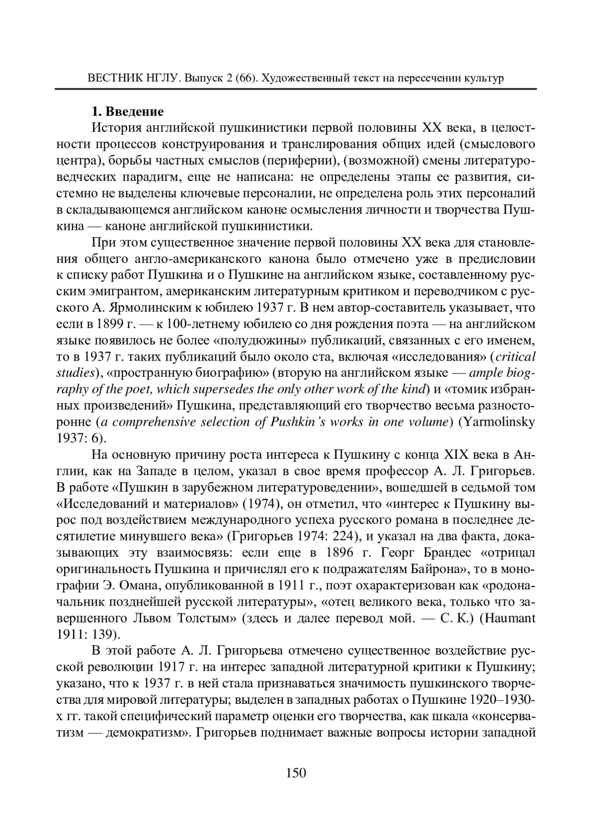 Между тем о таких особенностях, равно как о формировании канона английской пушкинистики в 1910–1940-е г., вполне можно говорить, учитывая значение работ Мориса Бэринга для развития английской пушкинистики. Это значение в 1946 г. было отмечено в еженедельнике «Британский союзник» (издававшемся в СССР на русском языке Министерством информации Великобритании), в статье «К смерти Баринга» (Голышева 1962: 114): проводя мысль о глубоком воздействии его «Очерка русской литературы» и «Оксфордской антологии русской поэзии» на общее представление английского интеллектуального читателя о русской литературе, авторы статьи особое внимание уделяют его переводам из Пушкина, в частности переводу пушкинского «Пророка» (Британский союзник 1946: 10).