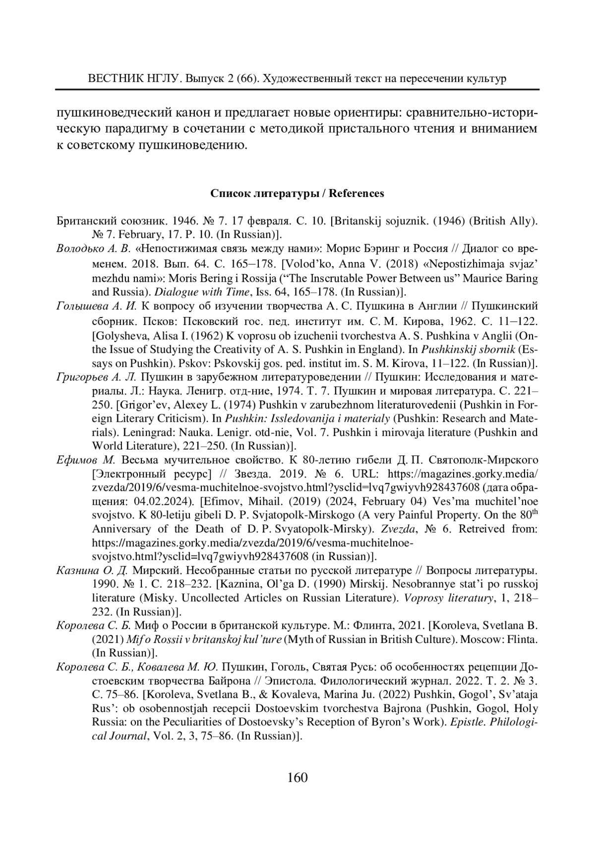 5. Ефимов М. Весьма мучительное свойство. К 80-летию гибели Д. П. Святополк-Мирского [Электронный ресурс] // Звезда. 2019. № 6. URL: https://magazines.gorky.media/zvezda/2019/6/vesma-muchitelnoe-svojstvo.html?ysclid=lvq7gwiyvh928437608 (дата обращения: 04.02.2024).