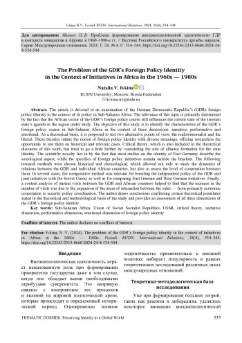 Рассматривается внешнеполитическая идентичность Германской Демократической Республики (ГДР) в контексте изучения ее политики в странах Африки южнее Сахары. Актуальность темы определяется, прежде всего, тем, что африканский вектор внешнеполитического курса ГДР до сих пор оказывает влияние на современное состояние повестки дня германского государства в исследуемом регионе.
