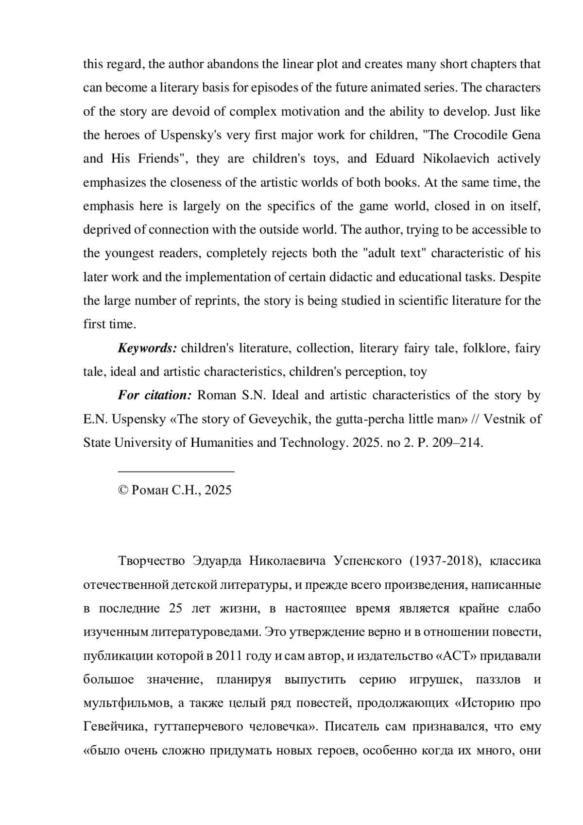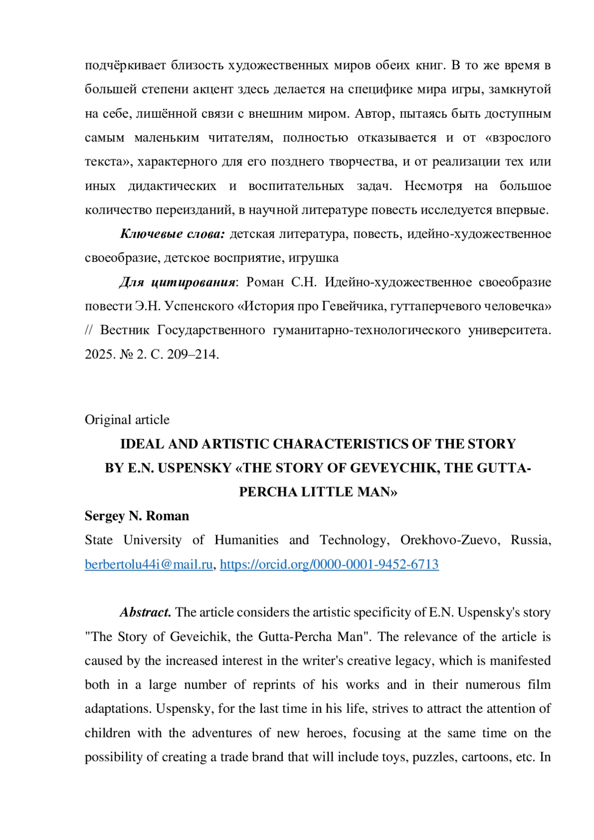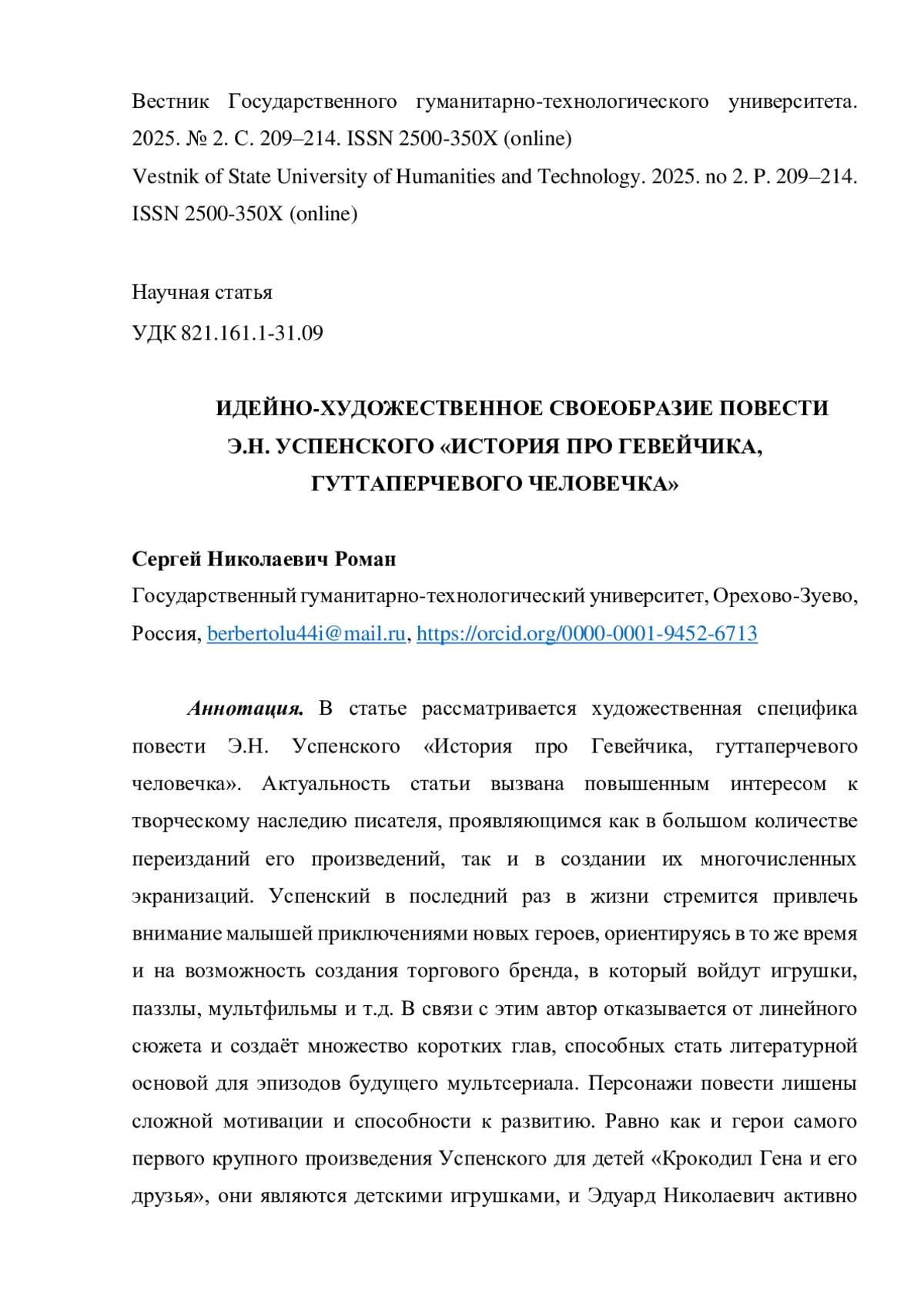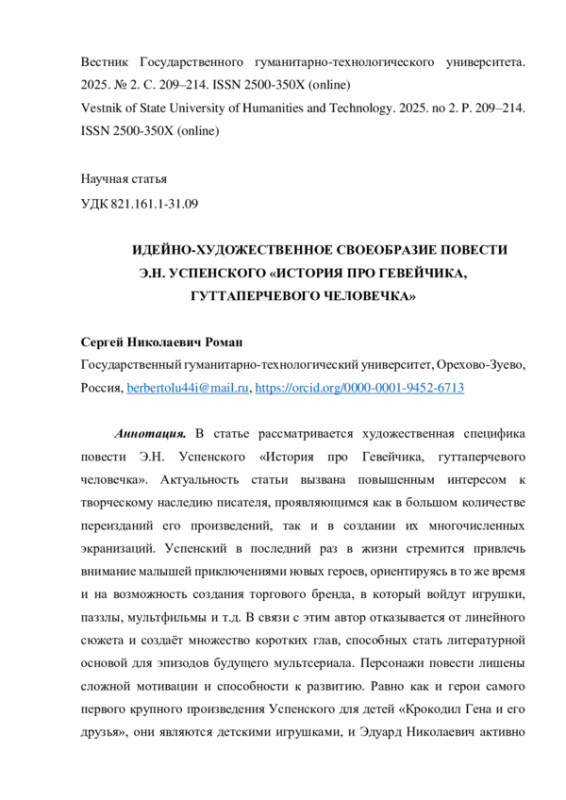 РОМАН С. Н. ИДЕЙНО-ХУДОЖЕСТВЕННОЕ СВОЕОБРАЗИЕ ПОВЕСТИ Э. Н. УСПЕНСКОГО «ИСТОРИЯ ПРО ГЕВЕЙЧИКА, ГУТТАПЕРЧЕВОГО ЧЕЛОВЕЧКА» // ВЕСТНИК ГОСУДАРСТВЕННОГО ГУМАНИТАРНО-ТЕХНОЛОГИЧЕСКОГО УНИВЕРСИТЕТА. 2025. № 2