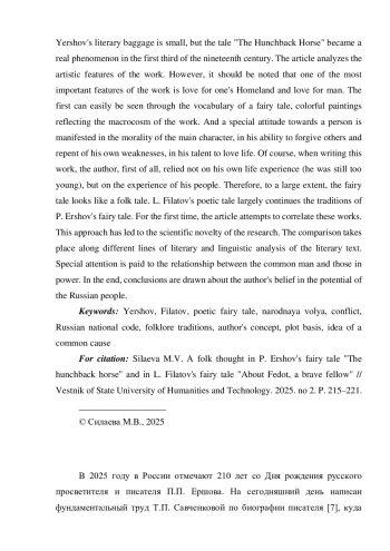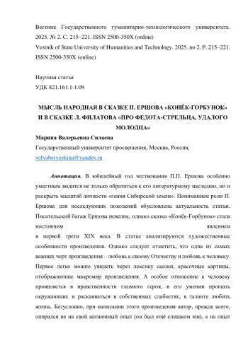 В юбилейный год чествования П. П. Ершова особенно уместным видится не только обратиться к его литературному наследию, но и раскрыть масштаб личности «гения Сибирской земли». Пониманием роли П. Ершова для последующих поколений обусловлена актуальность статьи. Писательский багаж Ершова невелик, однако сказка «Конёк-Горбунок» стала настоящим явлением в первой трети ХIХ века. В статье анализируются художественные особенности произведения. Однако следует отметить, что одна из самых важных черт произведения - любовь к своему Отечеству и любовь к человеку. Первое легко можно увидеть через лексику сказки, красочные картины, отображающие макромир произведения. А особое отношение к человеку проявляется в нравственности главного героя, в его умении прощать окружающих и раскаиваться в собственных слабостях, в таланте любить жизнь. Безусловно, при написании этого произведения автор, прежде всего, опирался не на свой жизненный опыт (он был ещё слишком юн), а на опыт своего народа. Поэтому в большой степени сказка выглядит как народная. Поэтическая сказка Л. Филатова во многом продолжает традиции П. Ершова. В статье впервые предпринята попытка соотнести эти произведения. Подобный подход обусловил научную новизну исследования. Сопоставление происходит по разным линиям литературоведческого и лингвистического анализа художественного текста. Особое внимание уделяется отношениям между простым человеком и власть имущим. В конце сделаны выводы о вере авторов в потенциал русского народа.