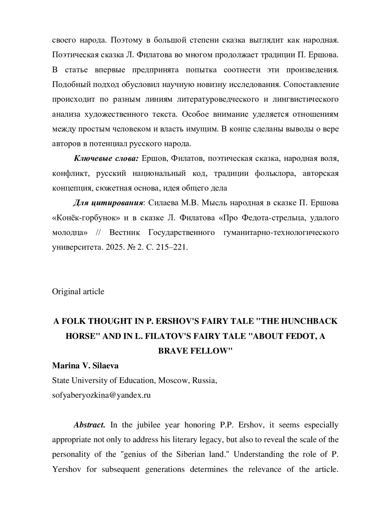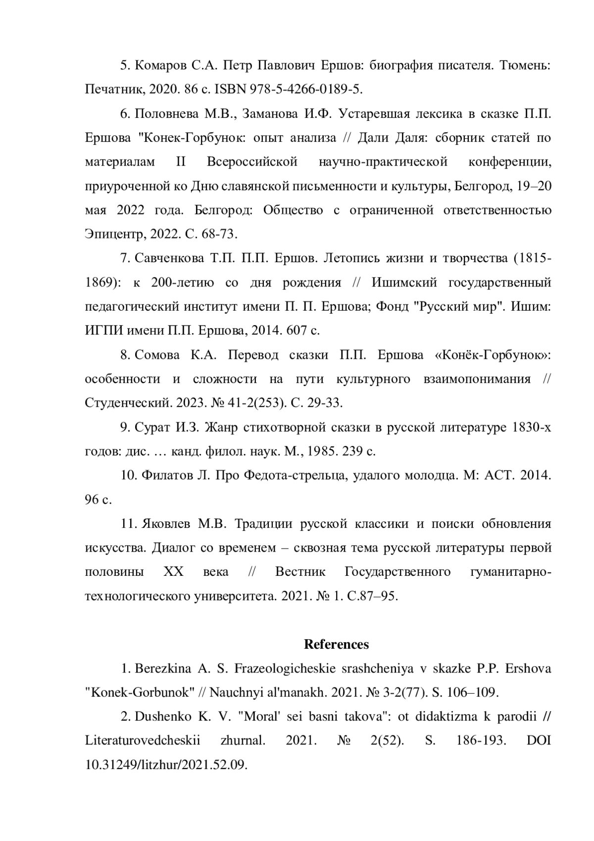 1. Березкина А. С. Фразеологические сращения в сказке П.П. Ершова “Конек-Горбунок” // Научный альманах. 2021. № 3-2(77). С. 106-109. EDN: FIBBVL