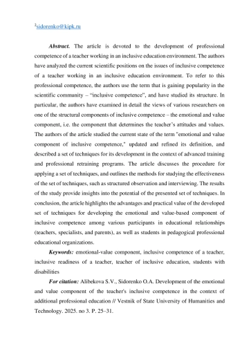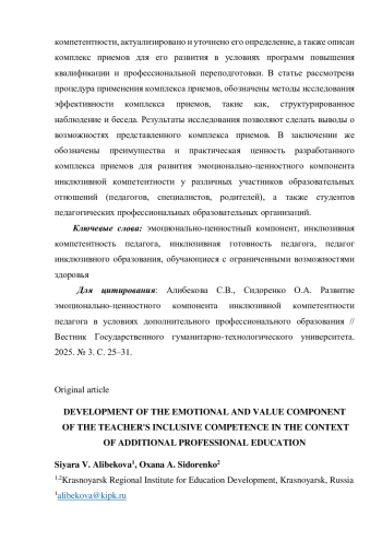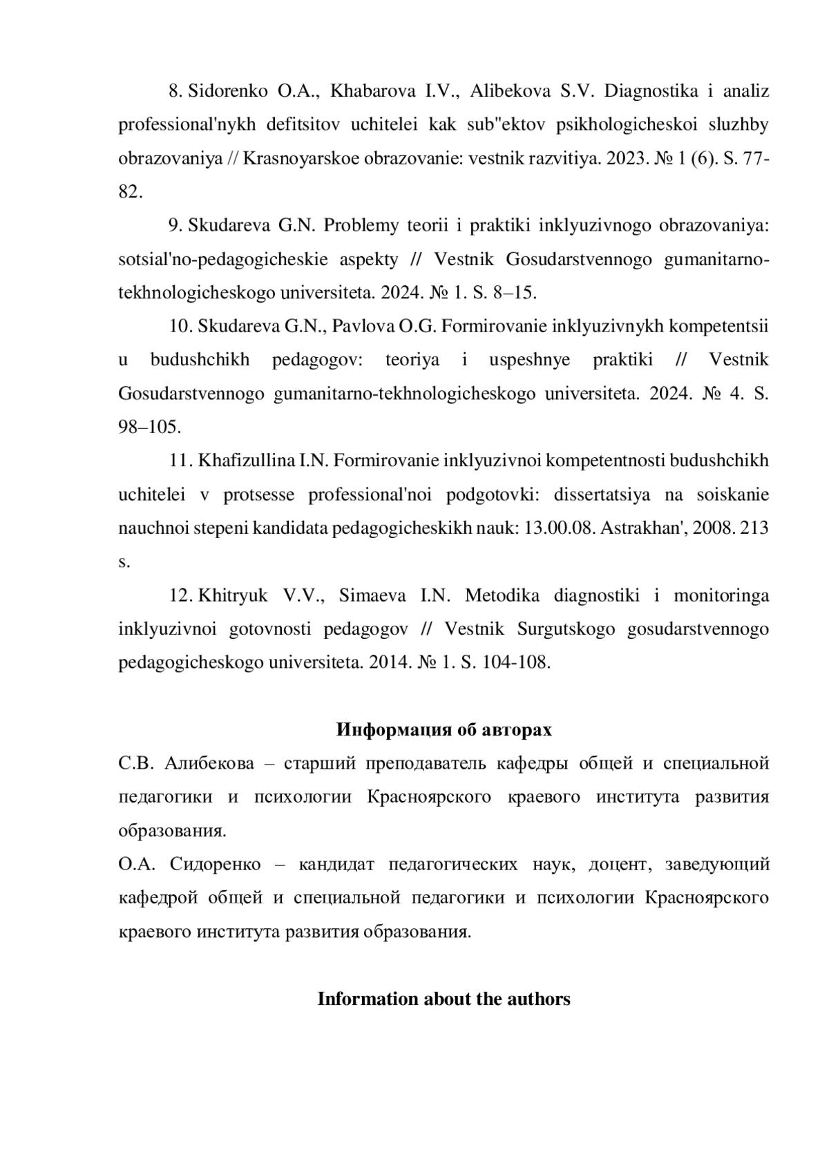 8. Сидоренко О.А., Хабарова И.В., Алибекова С.В. Диагностика и анализ профессиональных дефицитов учителей как субъектов психологической службы образования // Красноярское образование: вестник развития. 2023. № 1 (6). С. 77-82.