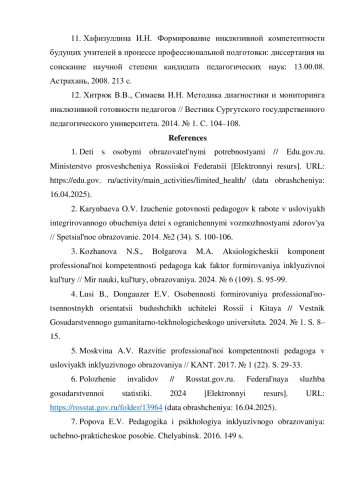 11. Хафизуллина И.Н. Формирование инклюзивной компетентности будущих учителей в процессе профессиональной подготовки: диссертация на соискание научной степени кандидата педагогических наук: 13.00.08. Астрахань, 2008. 213 с. EDN: NQFJFB