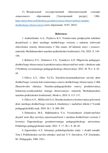 13. Федеральный государственный образовательный стандарт дошкольного образования [Электронный ресурс]. URL: https://pravobraz.ru/federalnyj-gosudarstvennyj-obrazovatelnyj-standart-doshkolnogo-obrazovaniya/(дата обращения: 19.07. 2025).