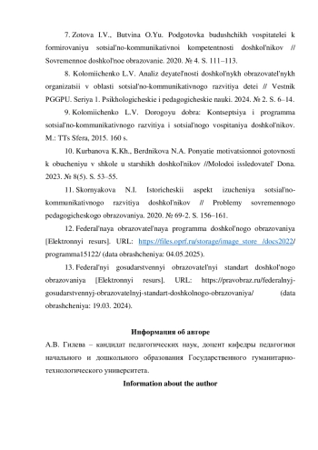 7. Зотова И.В., Бутвина О.Ю. Подготовка будущих воспитателей к формированию социально-коммуникативной компетентности дошкольников // Современное дошкольное образование. 2020. № 4. С. 111-113.