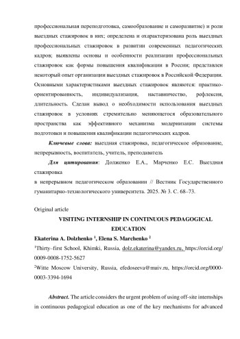 В статье рассмотрена актуальная проблема использования выездных стажировок в непрерывном педагогическом образовании как одного из ключевых механизмов повышения квалификации и развития профессионального мастерства педагогов. Выездная стажировка - достаточно комфортная форма обучения, предполагающая практическое освоение новых методик, технологий и подходов в реальной образовательной среде. Стажировки выступают важным инструментом не только для обновления знаний, но и для формирования устойчивой профессиональной идентичности, адаптации к новым вызовам и инновациям в сфере образования. Авторами рассмотрено понятие и значение профессиональных стажировок в системе непрерывного педагогического образования; дана характеристика этапов непрерывного педагогического образования (первоначальная подготовка, адаптация молодого специалиста, повышение квалификации, профессиональная переподготовка, самообразование и саморазвитие) и роли выездных стажировок в них; определена и охарактеризована роль выездных профессиональных стажировок в развитии современных педагогических кадров; выявлены основы и особенности реализации профессиональных стажировок как формы повышения квалификации в России; представлен некоторый опыт организации выездных стажировок в Российской Федерации. Основными характеристиками выездных стажировок являются: практико-ориентированность, индивидуализация, наставничество, рефлексия, длительность. Сделан вывод о необходимости использования выездных стажировок в условиях стремительно меняющегося образовательного пространства как эффективного механизма модернизации системы подготовки и повышения квалификации педагогических кадров.