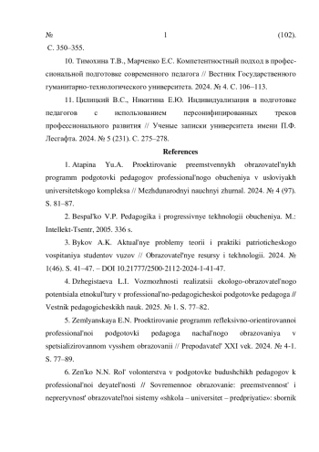 1. Атапина Ю.А. Проектирование преемственных образовательных программ подготовки педагогов профессионального обучения в условиях университетского комплекса // Международный научный журнал. 2024. № 4 (97). С. 81-87. EDN: BUDIJA