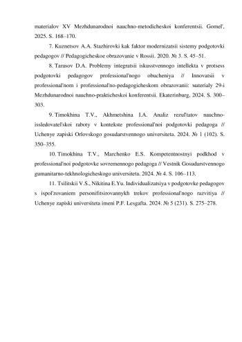 8. Тарасов Д.А. Проблемы интеграции искусственного интеллекта в процесс подготовки педагогов профессионального обучения // Инновации в профессиональном и профессионально-педагогическом образовании: материалы 29-й Международной научно-практической конференции. Екатеринбург, 2024. С. 300-303. EDN: CJCVXC