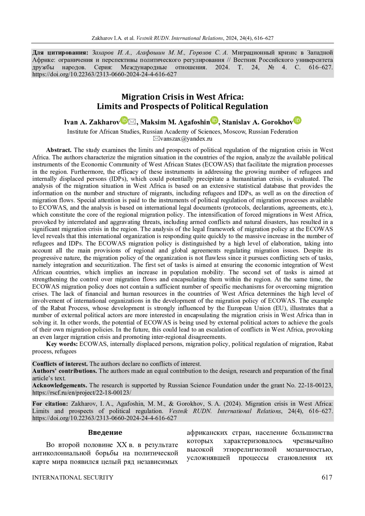 4. Горохов С. А., Агафошин М. М., Дмитриев Р. В. Миграционный кризис в регионе Восточной Африки // Восток. Афро-азиатские общества: история и современность. 2023. № 1. С. 50-62. ;. DOI: 10.31857/S086919080023788-3 EDN: LOUDGX